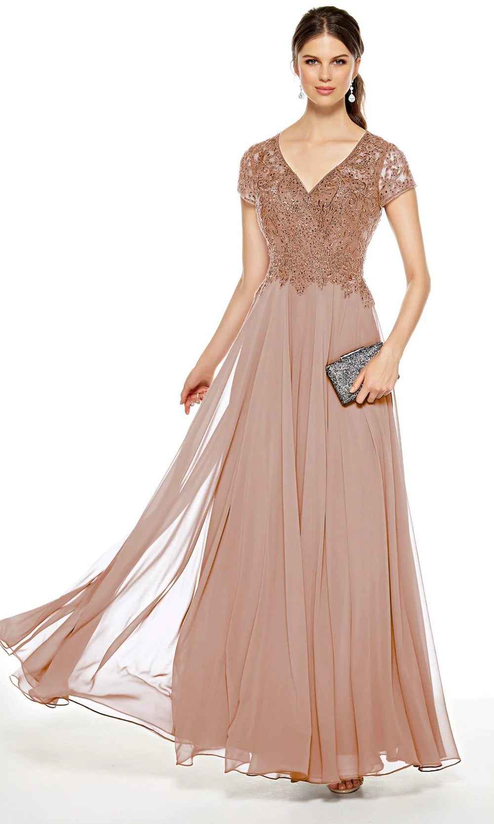 Delicate craftsmanship and airy elegance combine in this Alyce Paris 27389 floor-length gown that flatters with every step. The bodice glimmers with beaded lace that draws the eye to the V-neckline and short sleeves, adding coverage and charm. The natural waist transitions into a soft A-line chiffon skirt that flows gracefully, bringing effortless movement to the silhouette. Ideal for evening occasions or formal events, Alyce Paris 27389 offers timeless femininity through a blend of textures and fluid lines, ensuring the wearer stands out with poise and sophistication. Models are wearing Burgundy, Cashmere Rose, and Navy colors.
