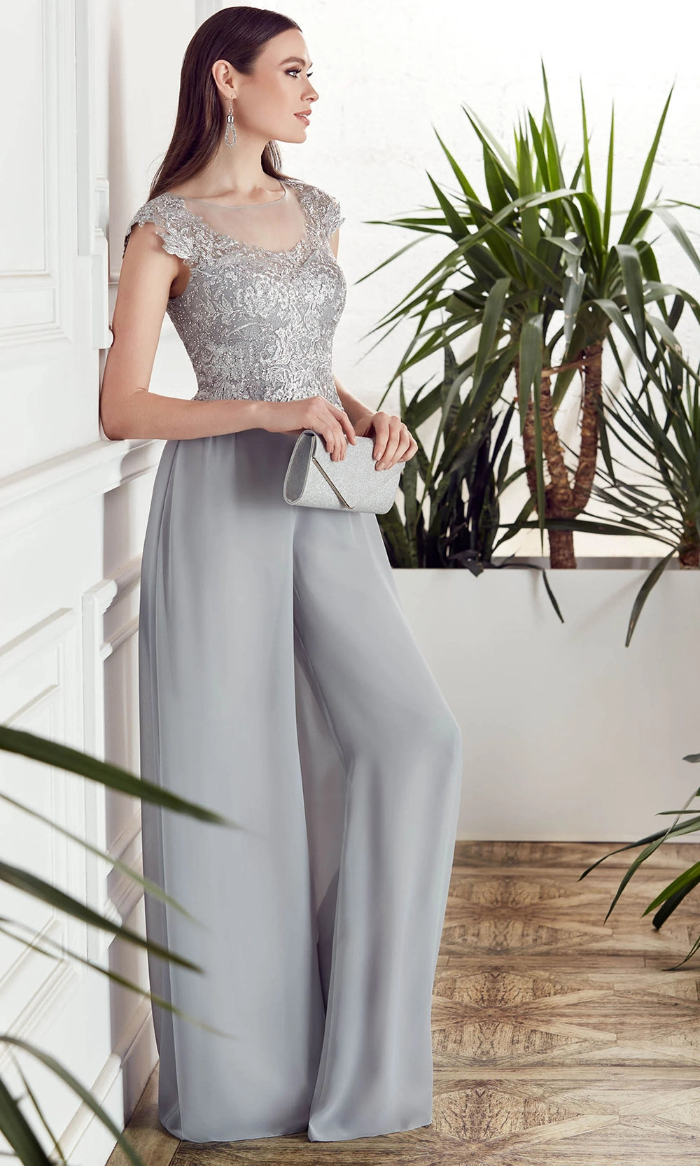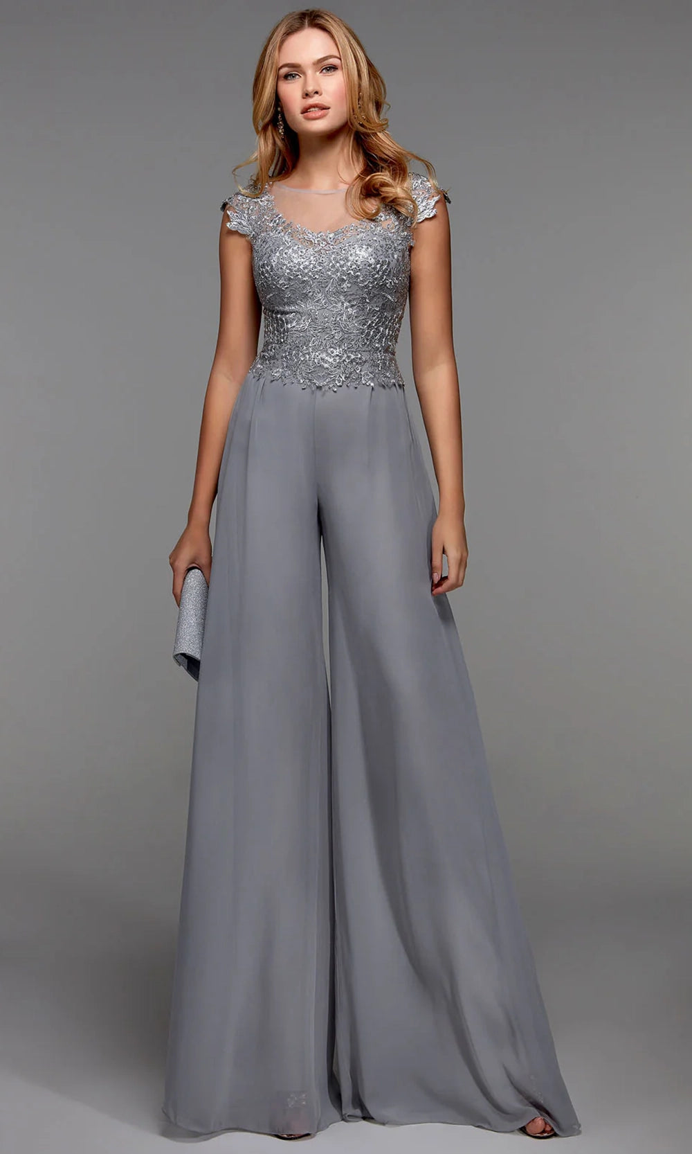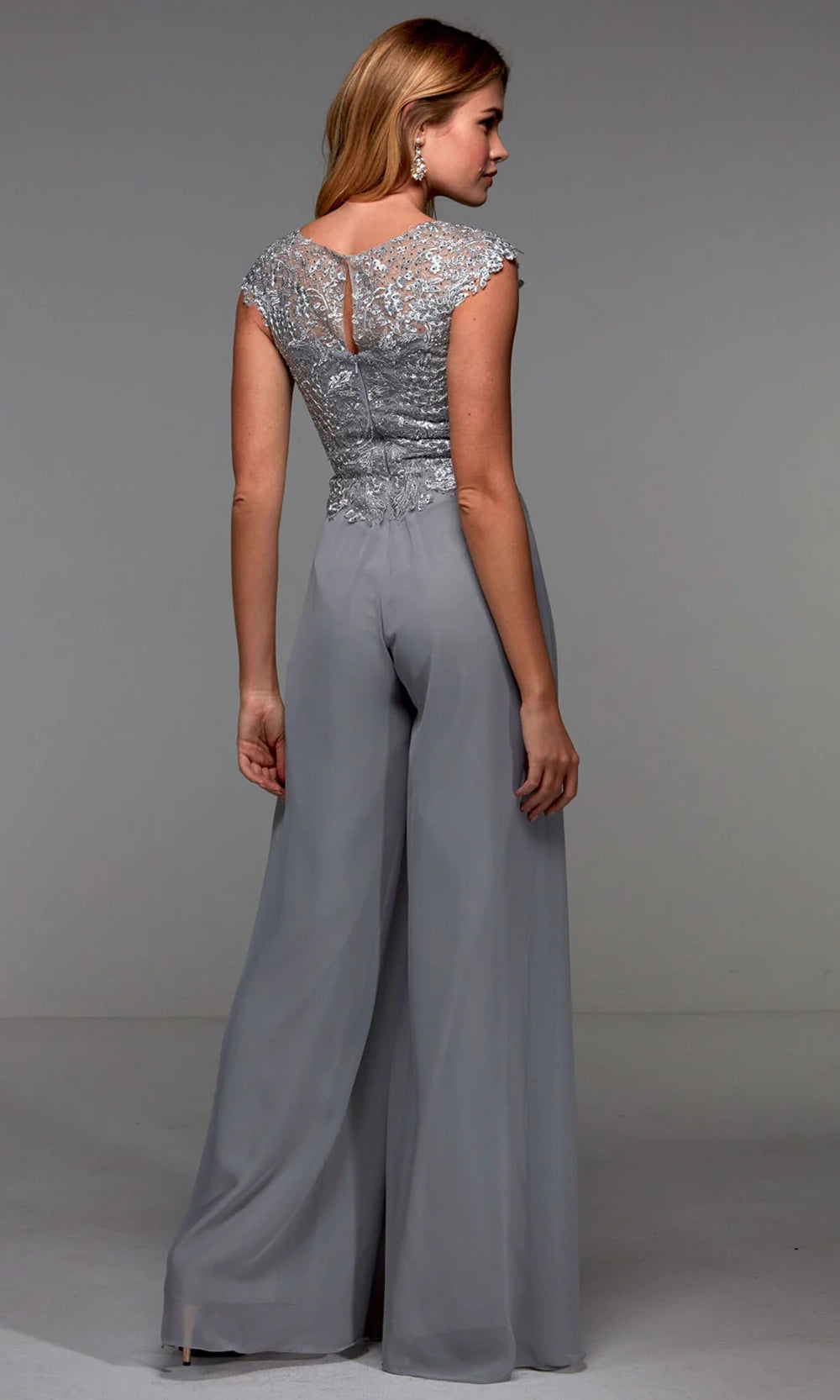 Redefine formalwear in this Alyce Paris 27488 chiffon jumpsuit that offers the elegance of a gown with the ease of trousers. The illusion bateau neckline and beaded lace bodice provide texture and refinement, while cap sleeves add classic coverage. From the natural waist, wide-leg pants flow effortlessly, offering a graceful silhouette and unmatched comfort. Every detail, from its tailored bodice to the breezy pant legs, evokes confidence and sophistication. Alyce Paris 27488 jumpsuit blends bold styling with timeless materials to create a piece perfect for mothers of the bride, galas, or evening events. Models are wearing Cashmere Rose, Midnight, and Silver colors.