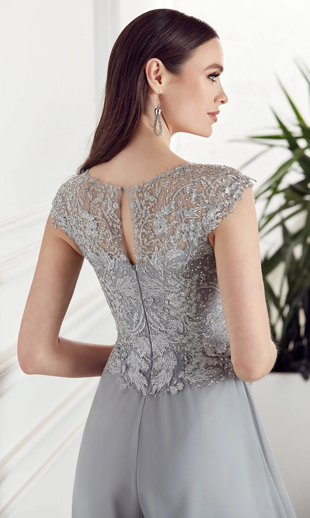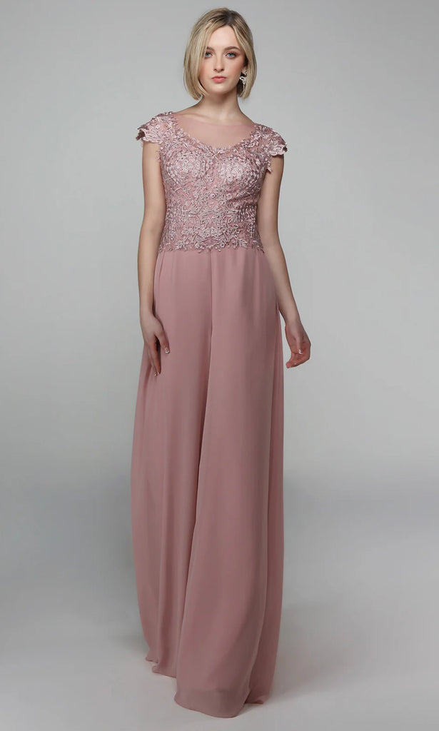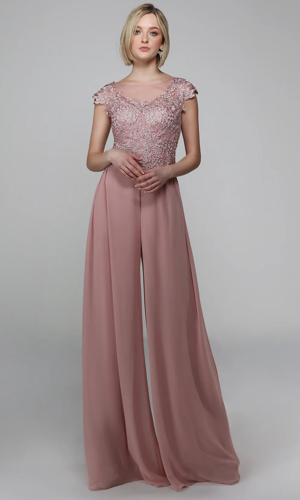Redefine formalwear in this Alyce Paris 27488 chiffon jumpsuit that offers the elegance of a gown with the ease of trousers. The illusion bateau neckline and beaded lace bodice provide texture and refinement, while cap sleeves add classic coverage. From the natural waist, wide-leg pants flow effortlessly, offering a graceful silhouette and unmatched comfort. Every detail, from its tailored bodice to the breezy pant legs, evokes confidence and sophistication. Alyce Paris 27488 jumpsuit blends bold styling with timeless materials to create a piece perfect for mothers of the bride, galas, or evening events. Models are wearing Cashmere Rose, Midnight, and Silver colors.