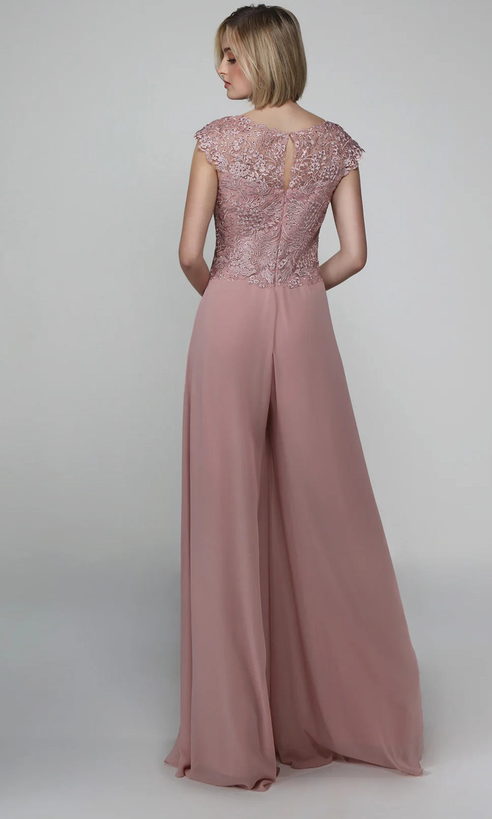 | Details: | Cap Sleeves, Illusion Neckline, Beaded Lace Bodice, Wide Leg Pants, Keyhole Back |