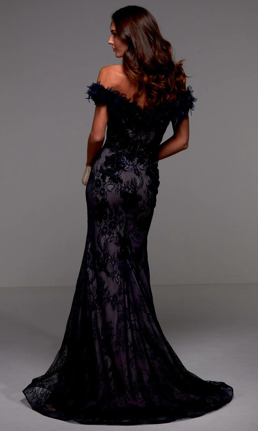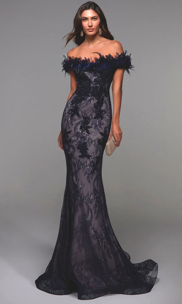 Unveil a bold yet elegant presence in the captivating silhouette of Alyce Paris 27490. This design features a structured sheath form, accentuated by an intricately beaded lace bodice and a daring off-shoulder neckline trimmed with dramatic feather embellishments. The figure-flattering design continues into a sweep train that creates fluid movement and amplifies the dress glamorous effect. The rich texture and architectural lines make this dress an unforgettable choice. Elevate your formal collection with Alyce Paris 27490 and step into your next occasion with unapologetic style and sophistication. Model is wearing Navy-Latte color.