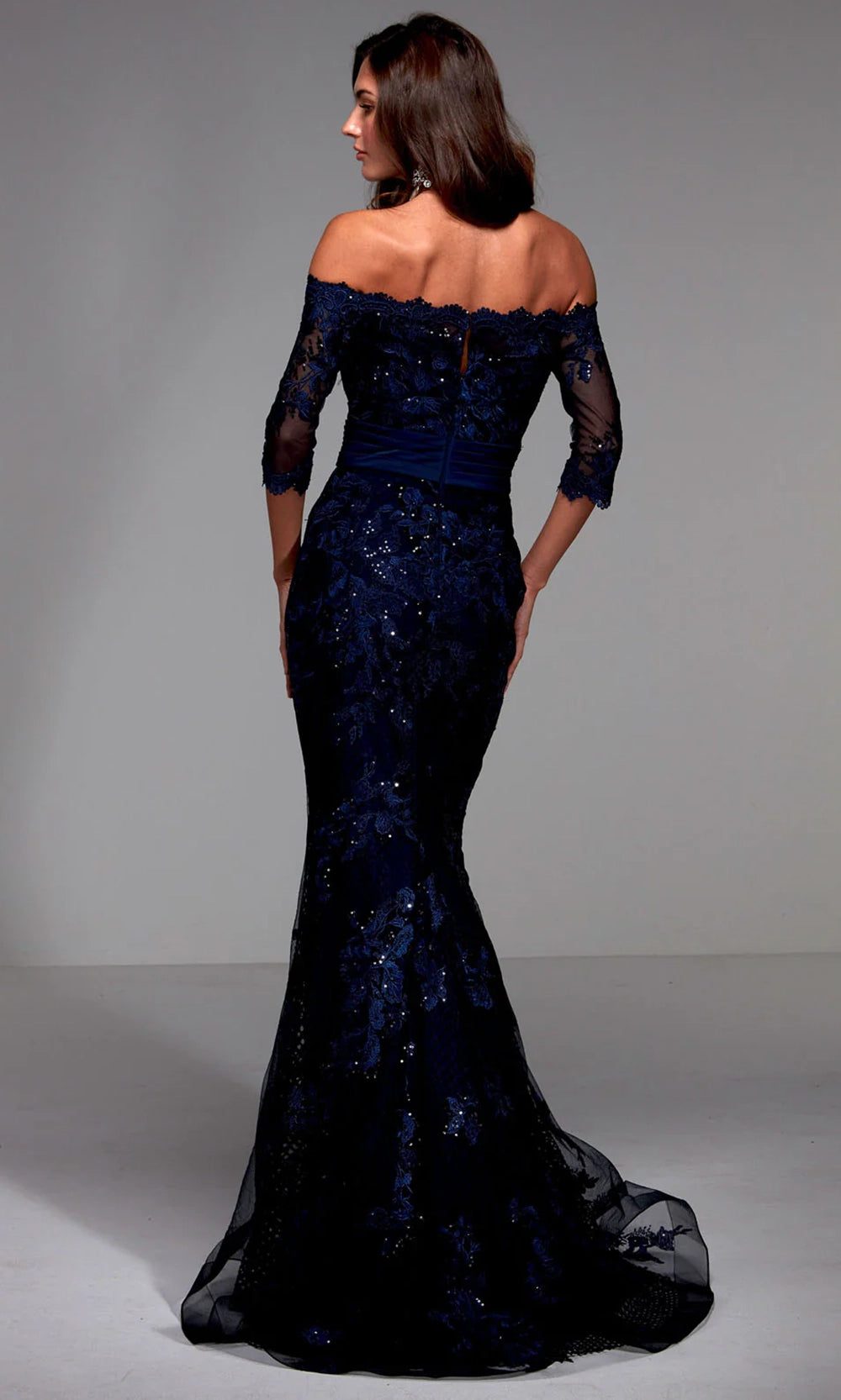 Alyce Paris 27495 style embraces detailed artistry and a figure-enhancing silhouette with equal measure. Sheer lace sleeves frame the straight off-shoulder neckline, while floral embroidery with beaded accent flows down the bodice and hips, offering texture and depth. A ruched wide waistband cinches the waist, drawing attention to the elegant mermaid flare. Impeccably tailored to flatter, the style merges classic charm with modern refinement. Step into distinguished elegance with Alyce Paris 27495, a look that leaves a lasting impression. Model is wearing Navy color.