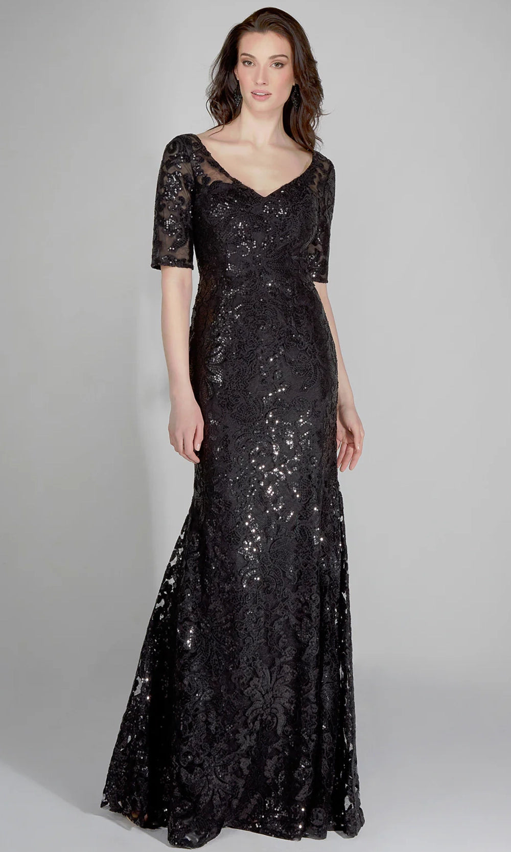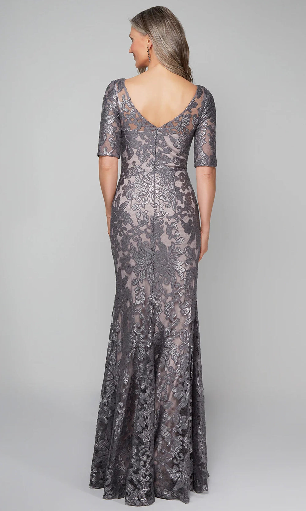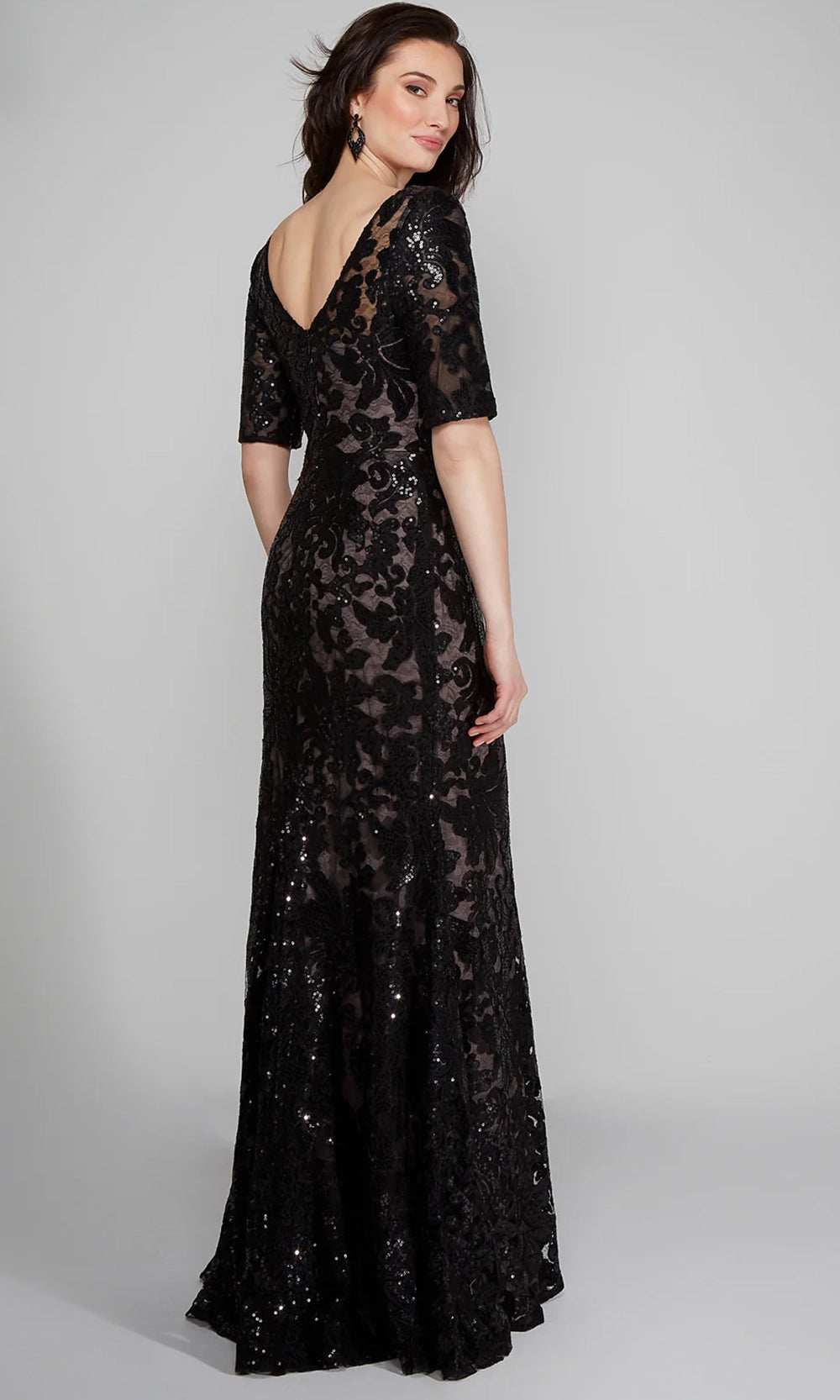 | Details: | Short Sleeve, Patterned Sequins, Fitted Bodice, V-Open Back, Floor Length |