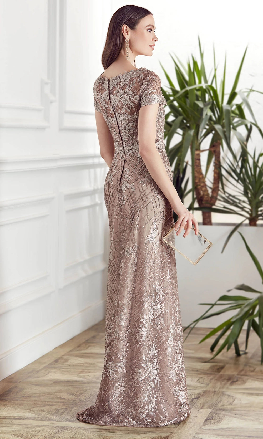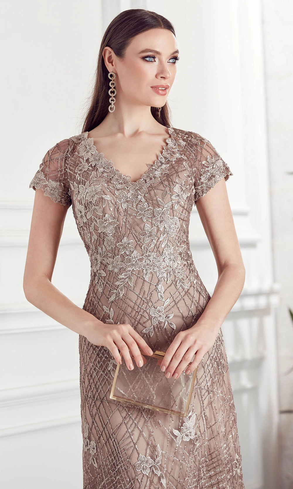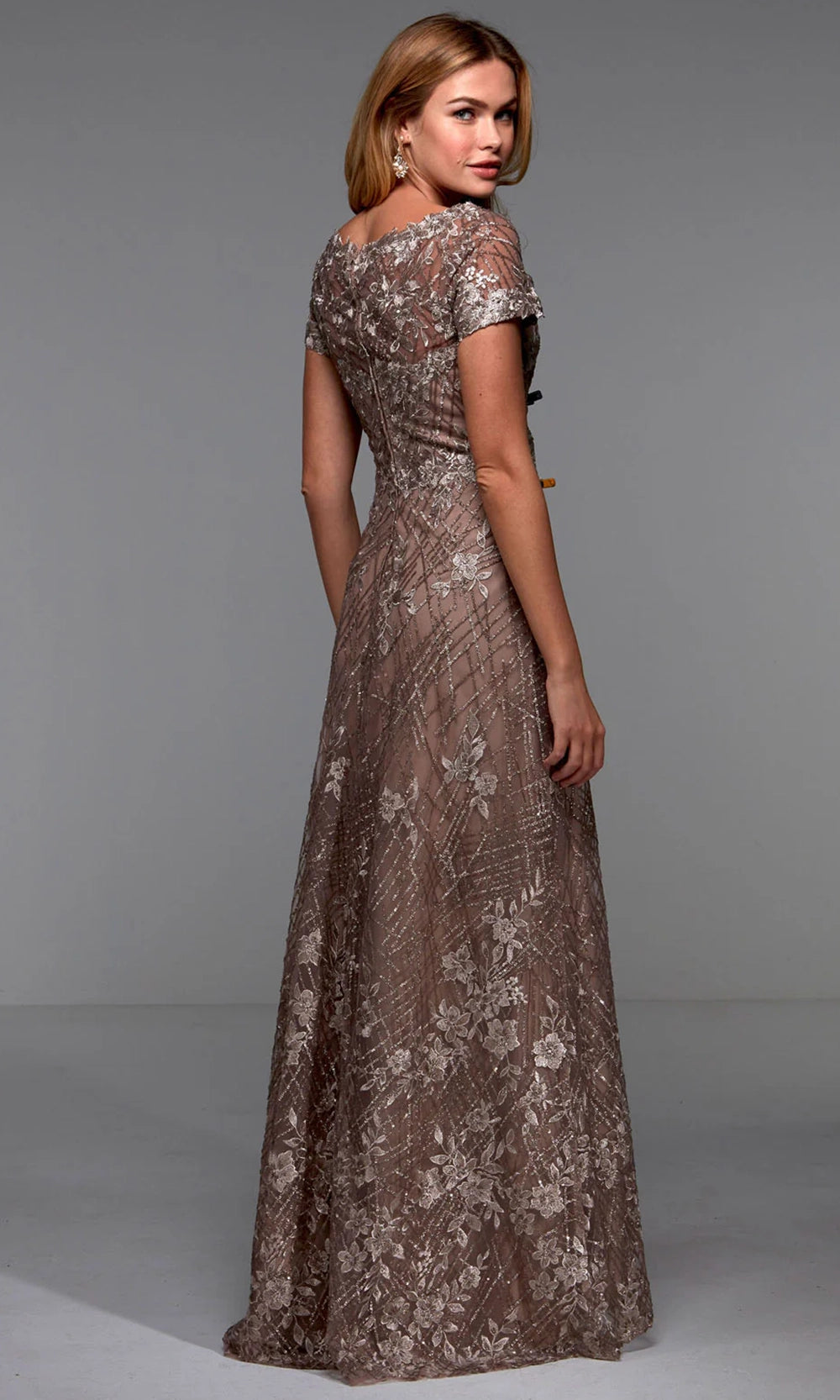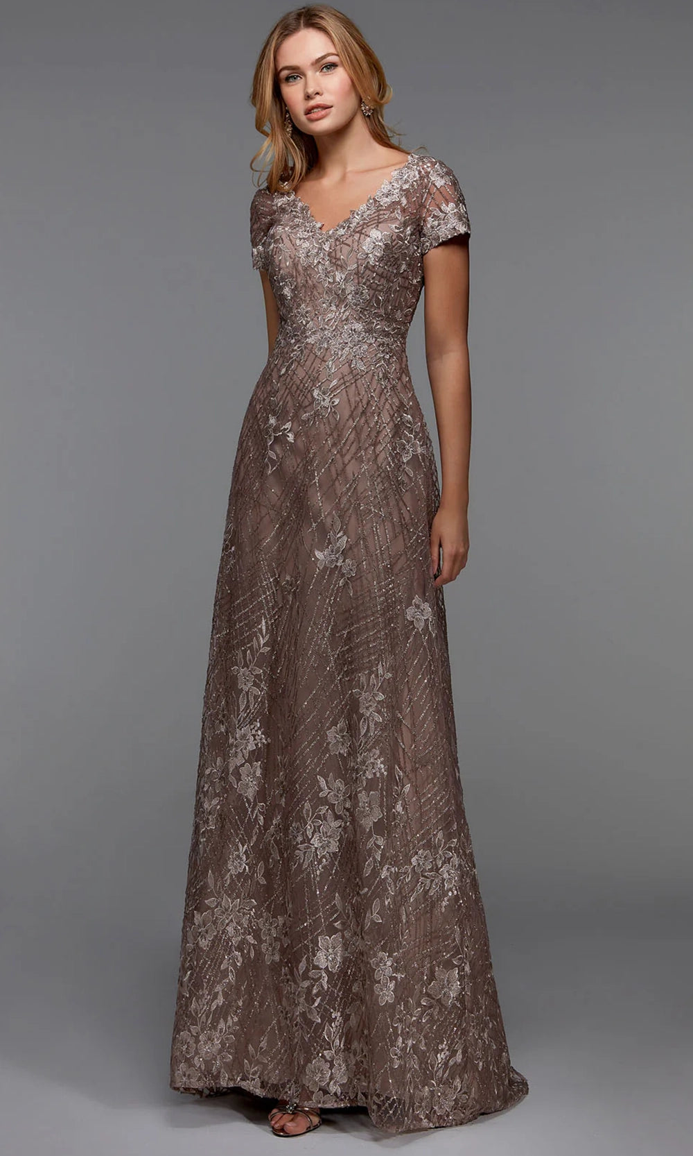 Let this Alyce Paris 27525 dress transform your evening into a display of polished elegance. It showcases a sheath silhouette enriched by delicately placed floral lace and shimmering sequins. The fitted bodice follows the curves with precision, while a modest V-neckline and short sleeves add demure sophistication. From neckline to hem, this ensemble offers a graceful harmony between intricate craftsmanship and modern lines. Ideal for those who appreciate soft elegance with subtle definition, Alyce Paris 27525 stands out through its refined embellishments and elegant shaping that transitions beautifully from day to evening. Model is wearing Shadow Grey color.