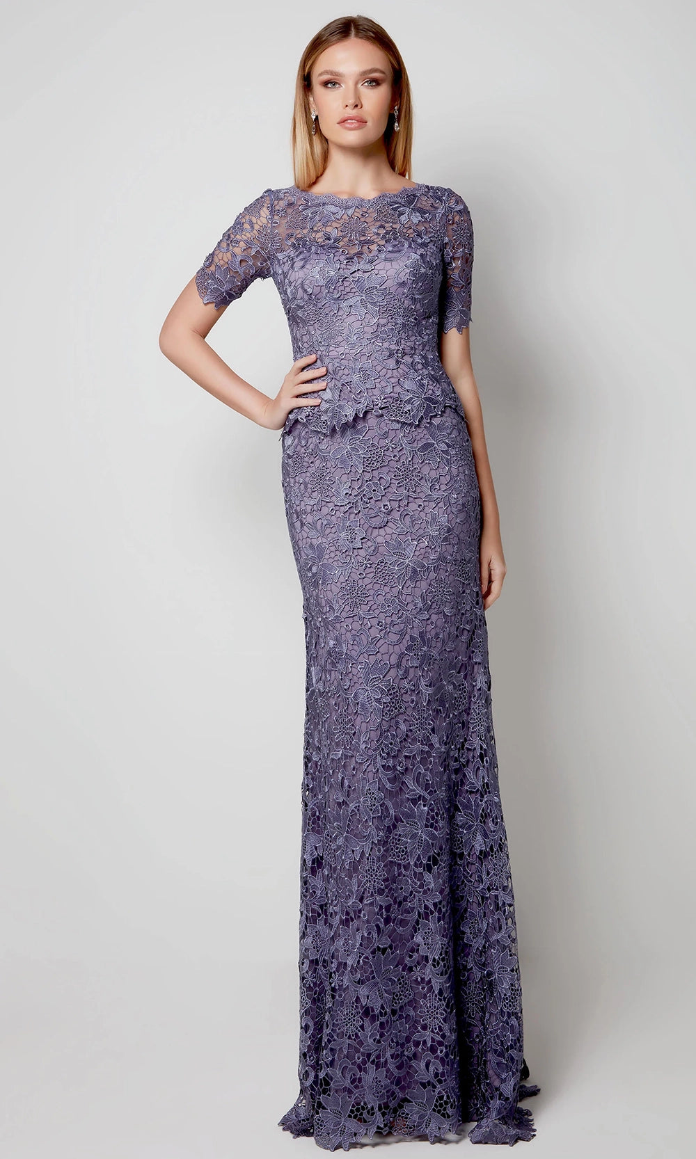 Elegance meets timeless craftsmanship in Alyce Paris 27555, where intricate lace detailing and a delicate silhouette make a graceful impression. This floor-length dress features sheer shirt sleeves with a refined floral lace overlay, giving the appearance of effortless softness. The scalloped trim and fitted sheath skirt add charm, while the bateau neckline enhances its classic form. With a harmonious balance of texture and structure, Alyce Paris 27555 offers understated sophistication, making it a standout choice for anyone who values refined beauty with contemporary polish and artisanal detail in every stitch. Model is wearing Storm Cloud color.