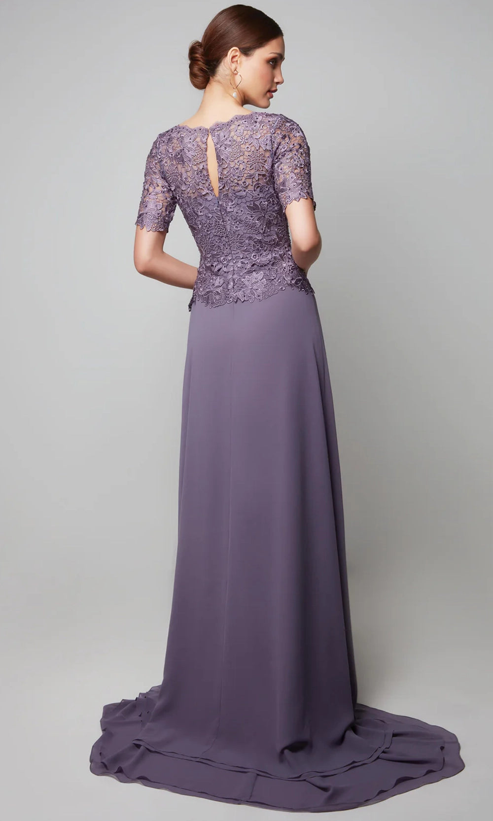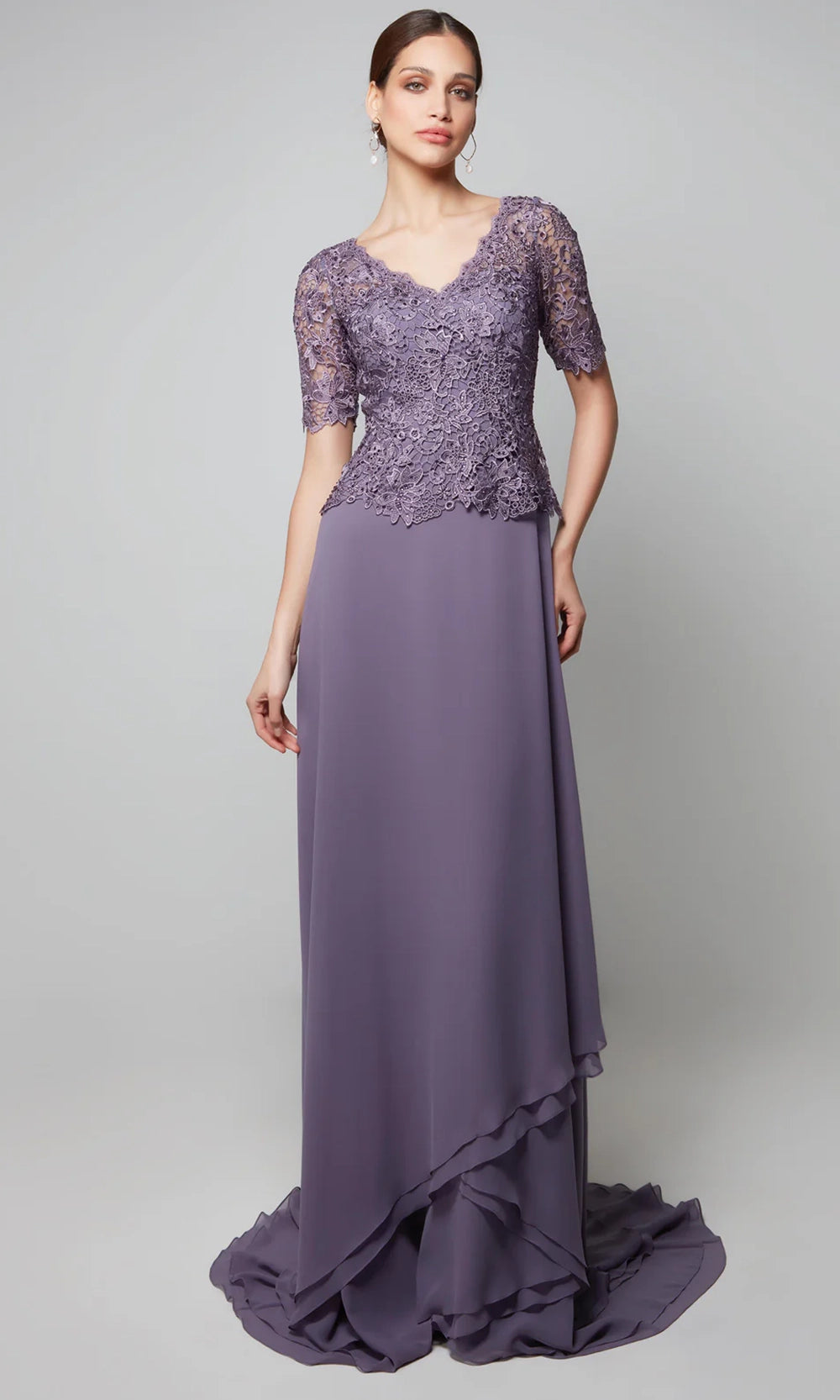 Movement and texture converge beautifully in Alyce Paris 27556, a floor-length dress that exudes romantic flair with every step. A fitted floral lace bodice with delicate scalloping at the waist flows into a softly chiffon A-line skirt, designed for graceful motion. The peplum waist adds a flattering detail that defines the figure, while sheer lace sleeves, v-neckline and asymmetrical tiered hem bring in an element of timeless refinement. Alyce Paris 27556 is an elegant embodiment of grace, offering a lovely balance between soft flow and structure for a look of effortless poise. Model is wearing Hydrangea color.