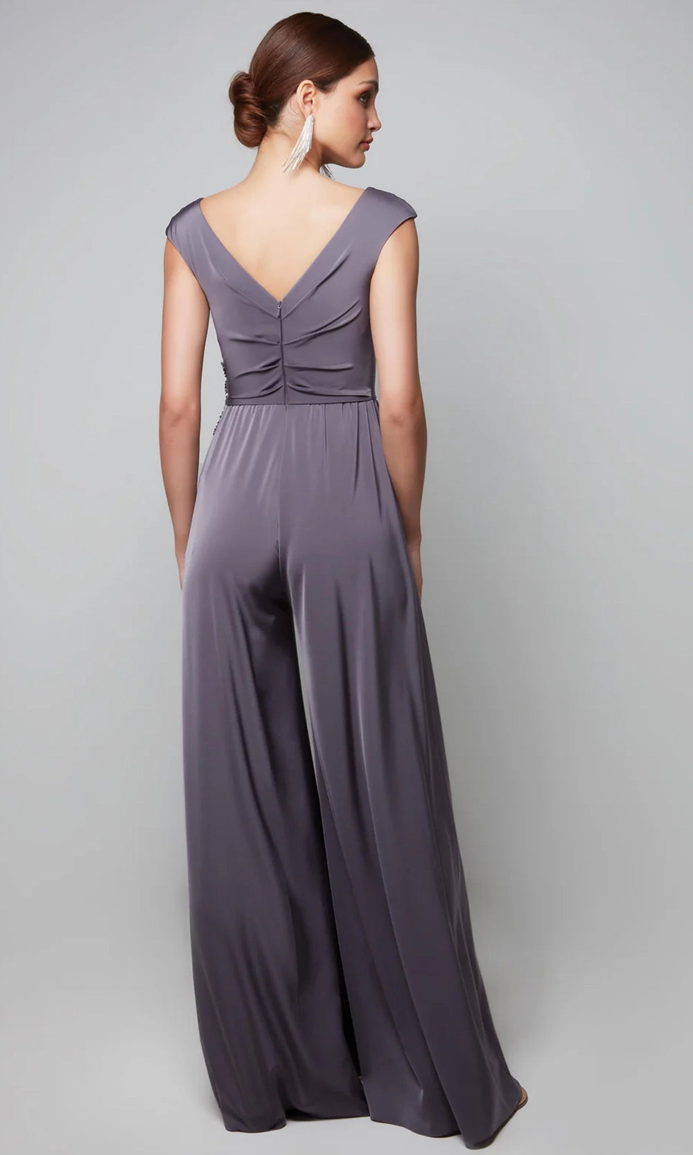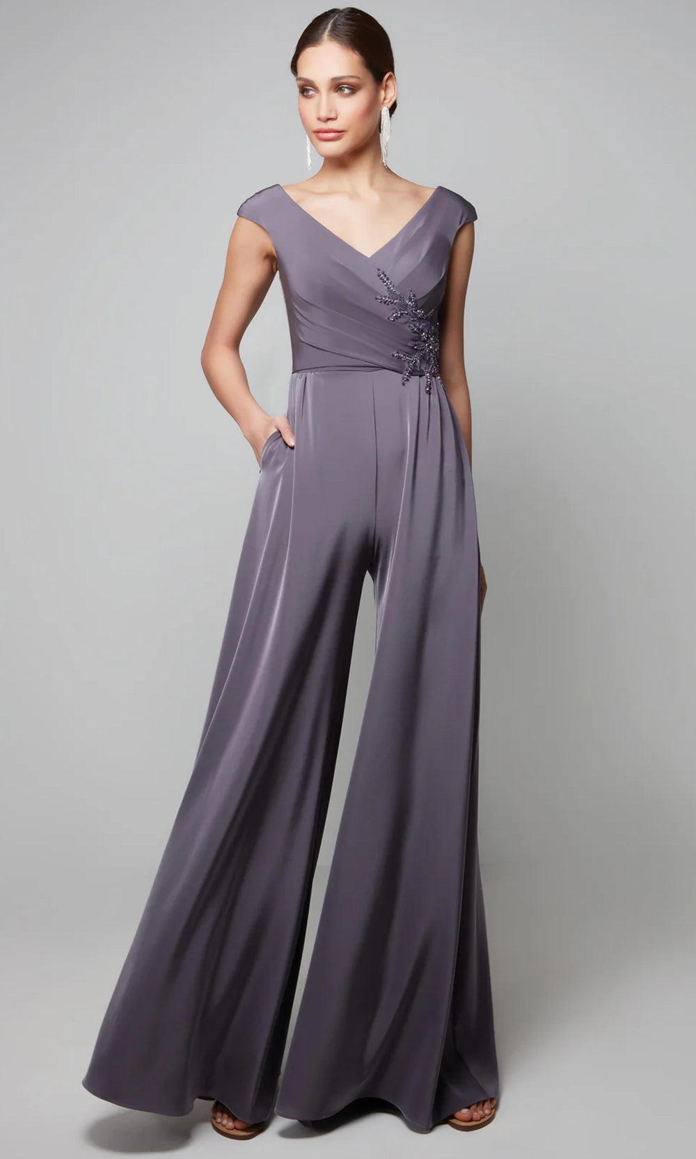 Alyce Paris style 27559 reimagines evening style with a modern jumpsuit silhouette that blends structure and elegance. Featuring a deep V-neckline and cap sleeves, the bodice is enhanced with intricate beadwork that adds dimension and refinement. The natural waist defines the shape, while wide leg pants offer comfort and a statement-making profile. Functional side pockets blend seamlessly into the flowing design without interrupting its clean lines. Alyce Paris 27559 style offers a confident alternative to gowns, perfect for those who appreciate form, function, and sophistication. Model is wearing Graphite color.