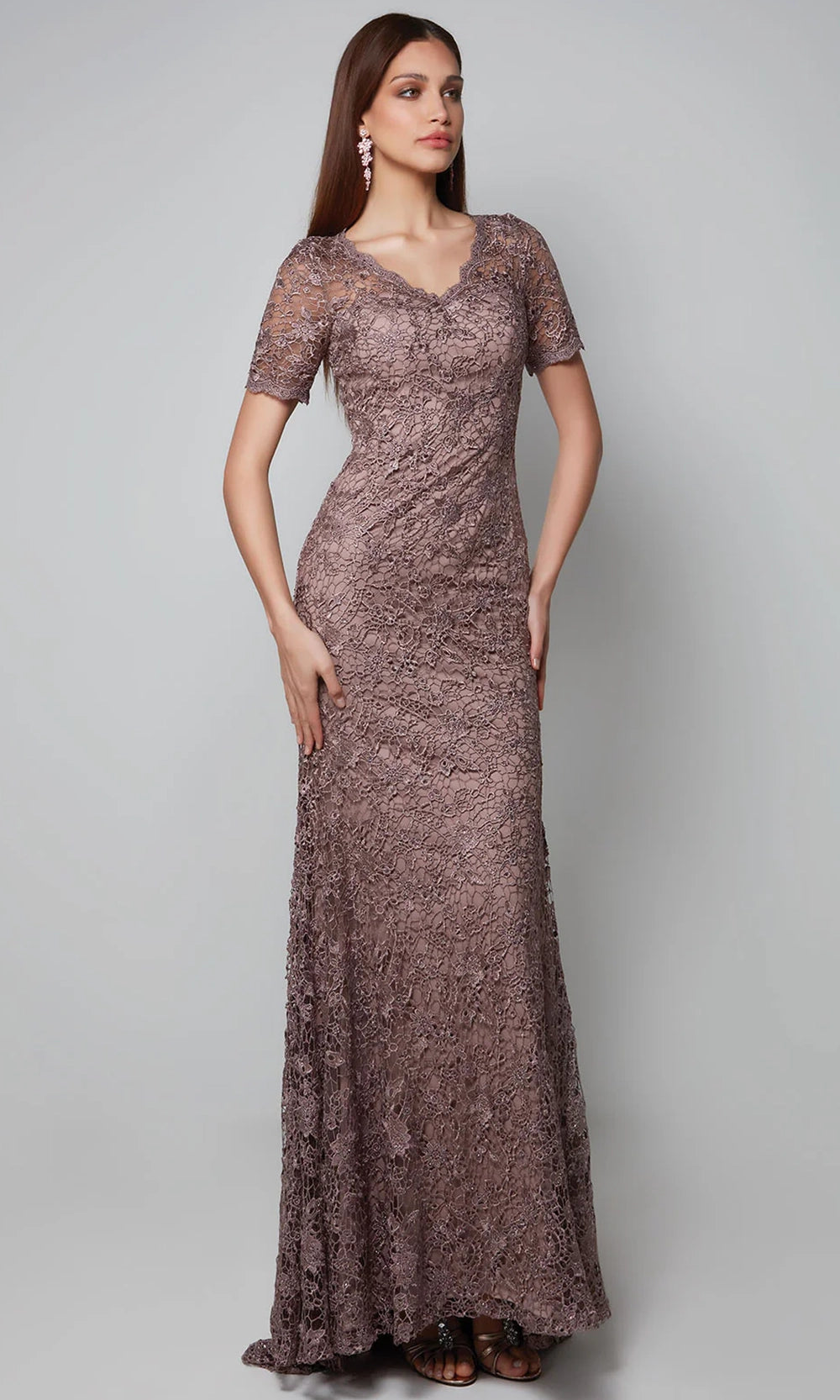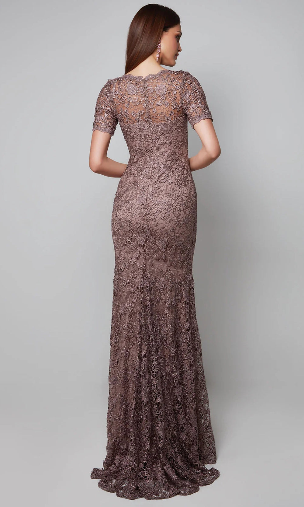Alyce Paris 27561 is a refined dress that combines vintage floral lace with a modern silhouette for a sophisticated yet feminine look. The design embellished with floral lace throughout exude a classy femininity. A classic V-neckline and short sleeves balance coverage with delicacy, while the form-fitting sheath silhouette follows the body contours beautifully. Soft lining ensures comfort, and the partial illusion back is secured by hidden zipper closure. Alyc e Paris 27561 offers a perfect blend of classic romance and contemporary style, ideal for graceful and confident wearers. Model is wearing Smoke color.