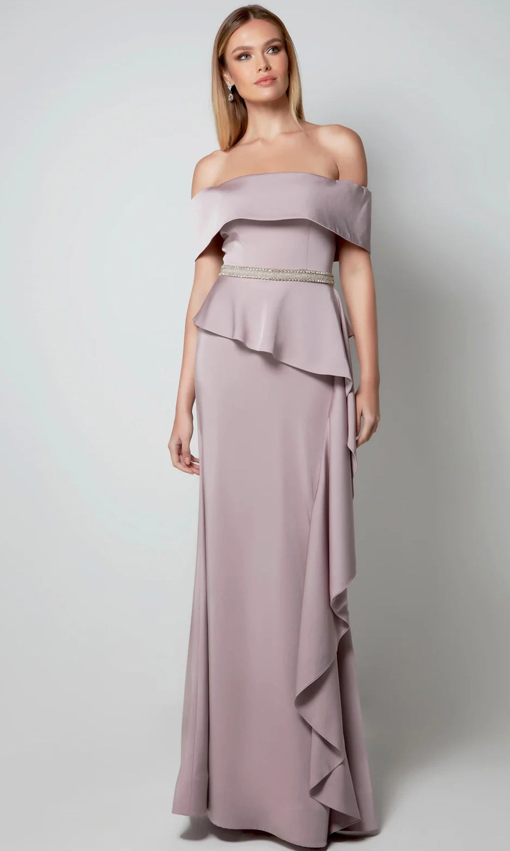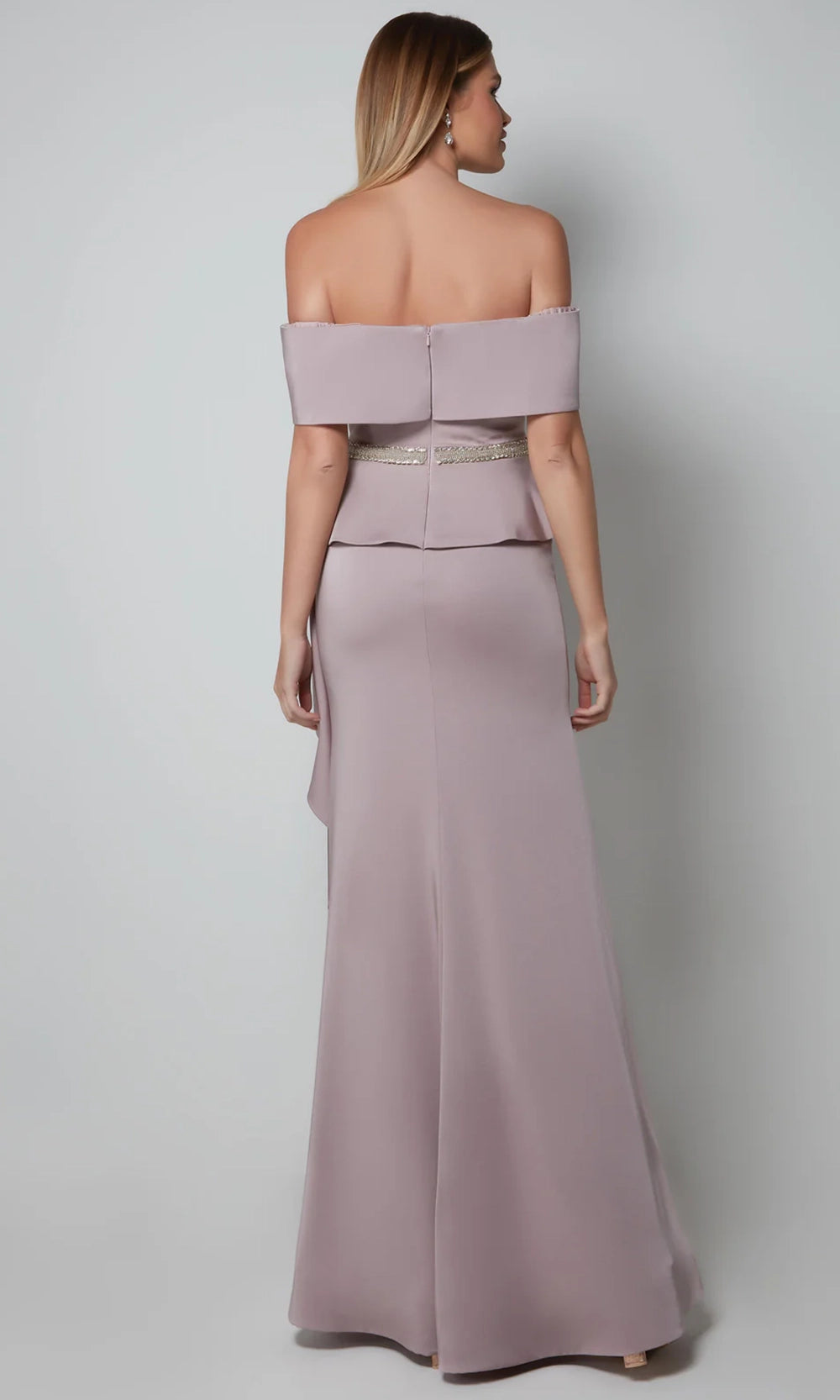 Soft draping and subtle elegance come together beautifully in Alyce Paris 27563 style. This gown features a graceful folded detail that gently frames the off-shoulder straight across neckline, mid-open back and short sleeves. The bodice hugs the form with smooth structure, enhanced by a beaded embellished waistband that adds a touch of refinement. Asymmetrical peplum with side cascading drape creates movement and depth through the floor-length sheath skirt. For those who appreciate romance in tailoring and timeless silhouettes, Alyce Paris 27563 gown delivers a graceful balance of structure and charm. Model is wearing Soft Heather color.