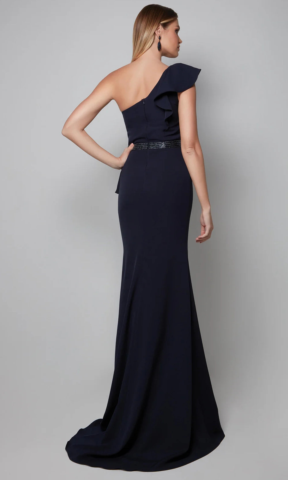 Embrace enduring beauty in the Alyce Paris 27577 gown that defines graceful elegance. The plays with asymmetry through cascading ruffles and a shimmering beaded waistband adds texture and shape. Crafted in a structured italian knit fabric, the design hugs the waist and hips before opening to a floor-length sheath silhouette with a daring side slit. The asymmetric neckline and back create visual intrigue, complemented by a one-shoulder cap sleeve for added structure. Designed for upscale receptions and stylish celebrations, this Alyce Paris 27577 style makes every moment a standout. Model is wearing Midnight color.