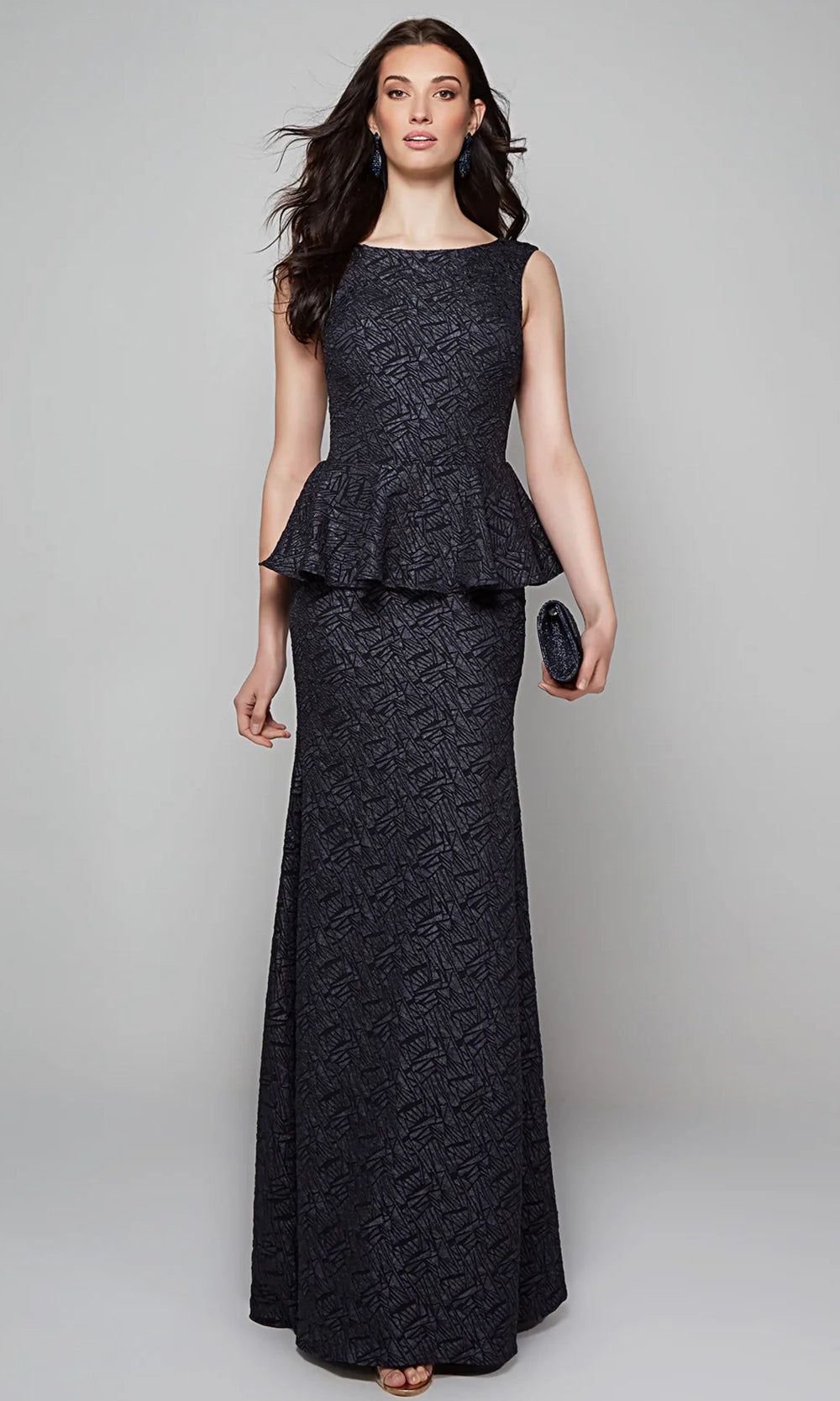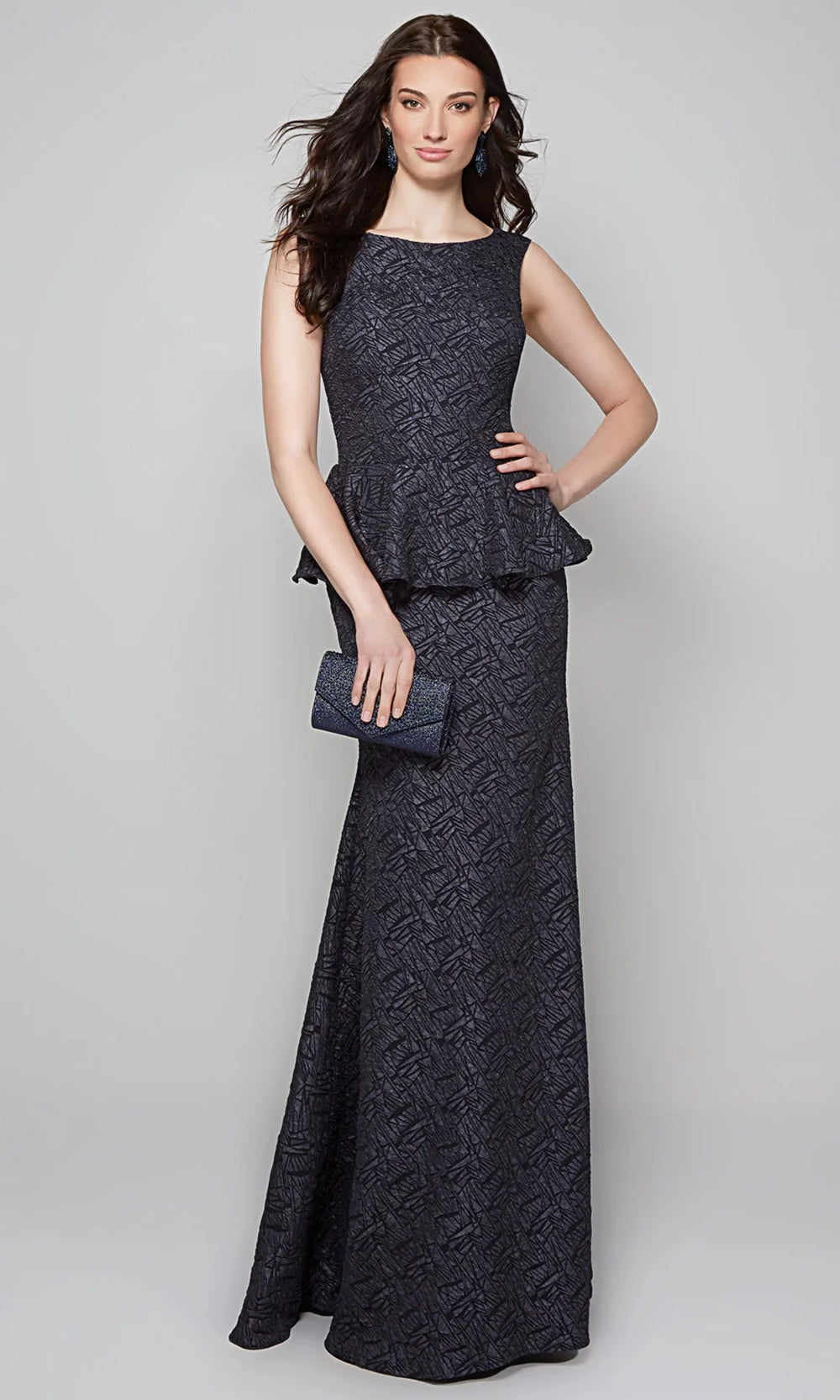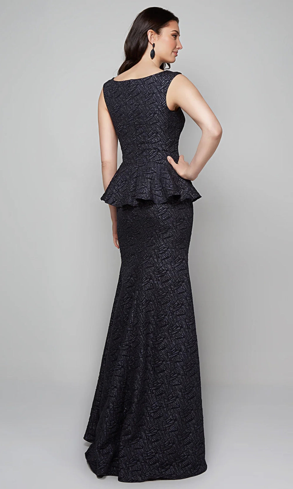 Crafted for elegant affairs, Alyce Paris 27579 features structured simplicity with just the right touch of flair. A scoop neckline offers refined coverage, while the sleeveless bodice complements the clean lines of the silhouette. A flared peplum detail at the waist creates shape and movement, highlighting the figure with subtle drama. The jacquard fabric adds dimensional texture, making this gown visually rich while remaining timeless. Choose Alyce Paris 27579 to make an impression rooted in sophistication and modern minimalism. Model is wearing Black color.