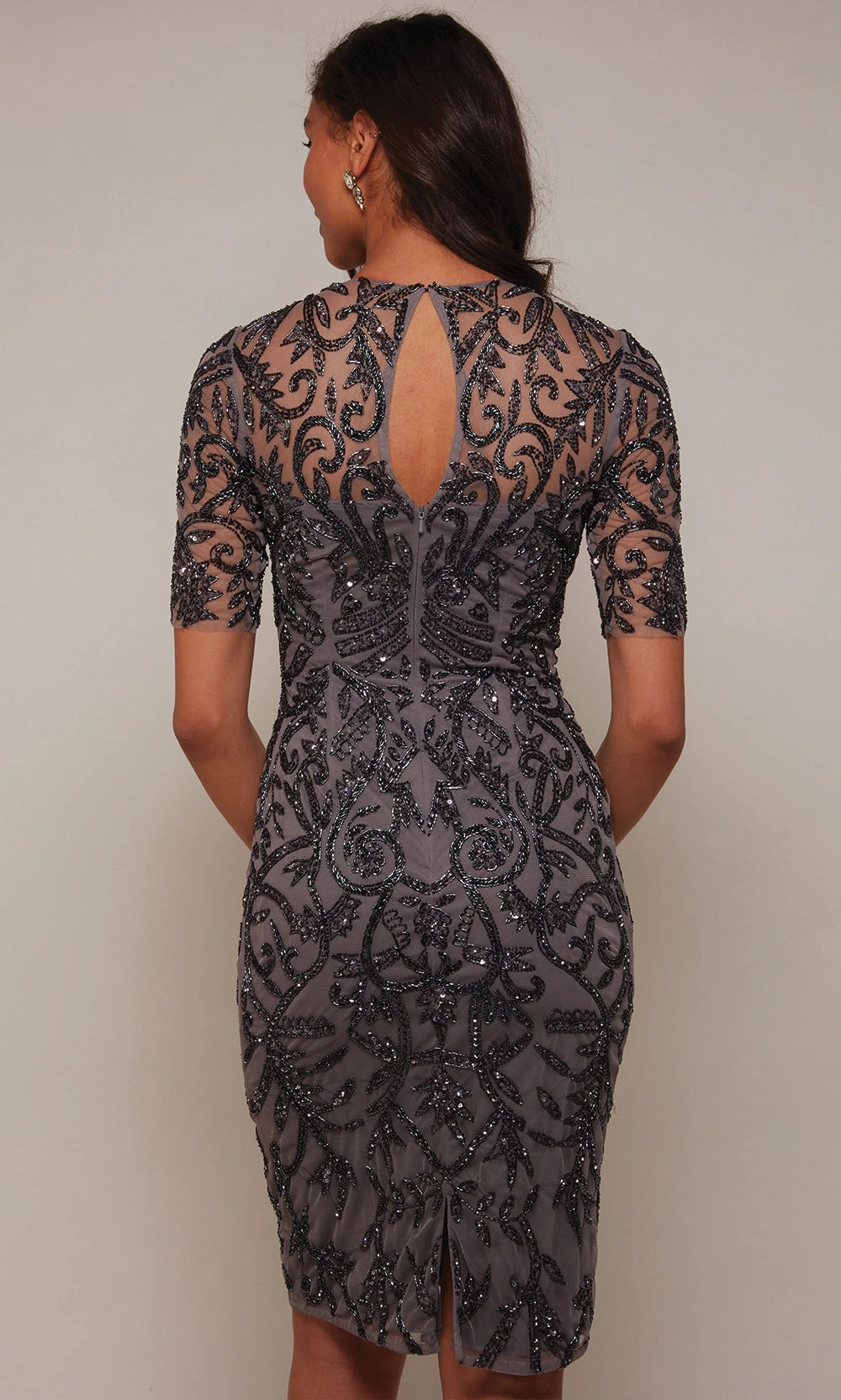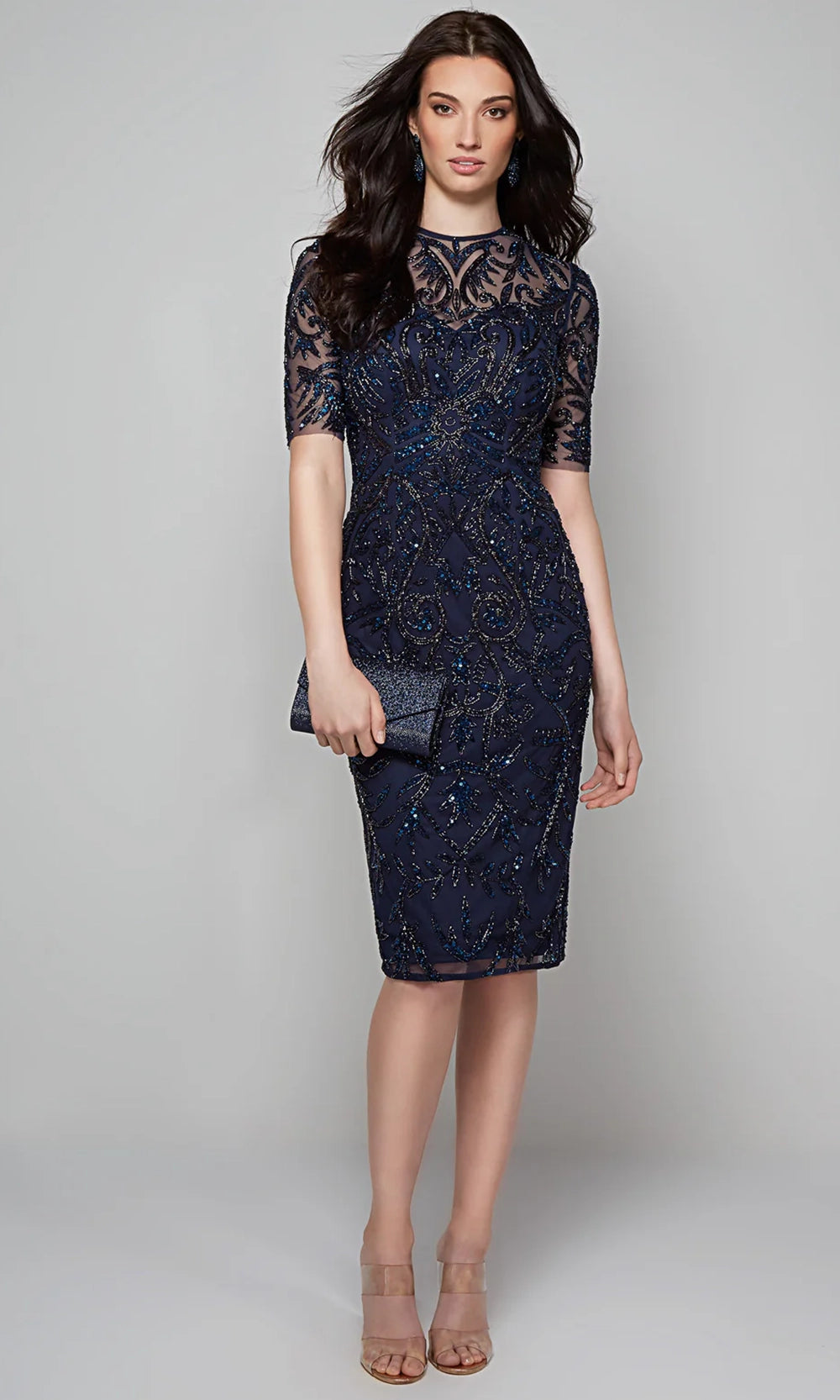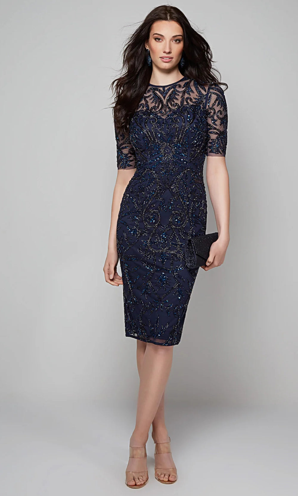 Embrace the allure of high style in this Alyce Paris 27583 dress that captures bold, luminous beauty. It features a jewel illusion neckline and semi-sheer short sleeves that provide just the right amount of coverage. Its mesh overlay is adorned with radiant beadwork detailing that captures light with every movement, offering sparkle without overwhelming the form. A fitted sheath skirt hugs the figure for a clean, elegant profile. Perfect for cocktail receptions or upscale parties, this Alyce Paris 27583 style merges classic modesty with modern edge in a truly timeless piece. Models are wearing Midnight, and Grey colors.