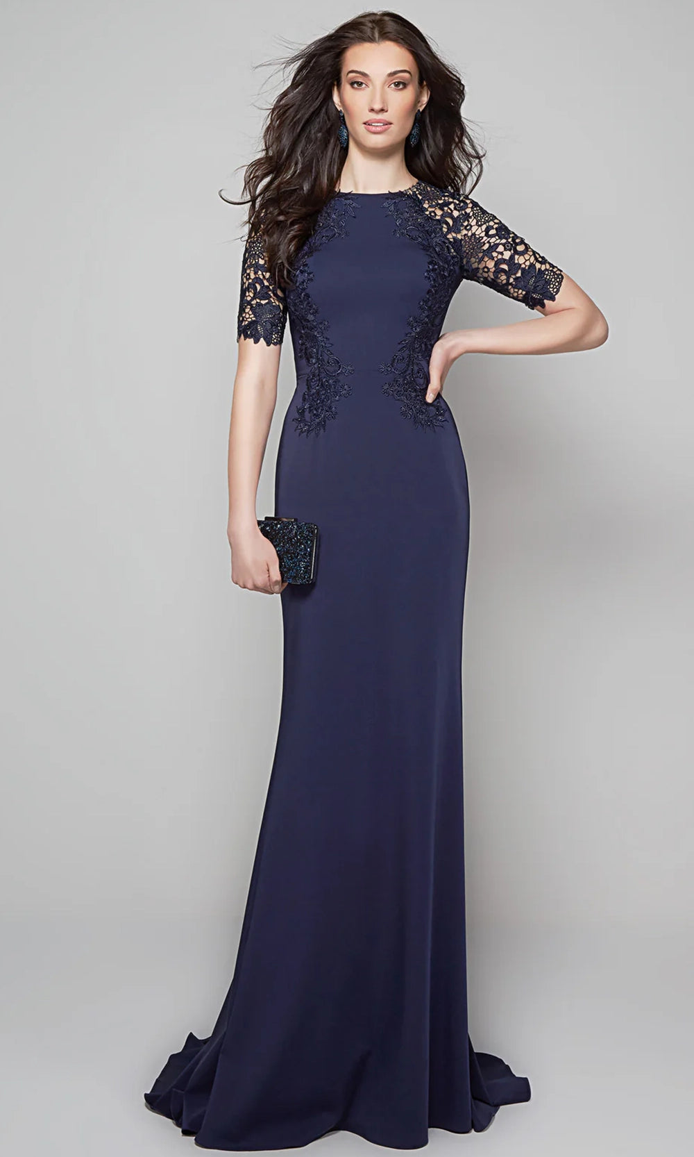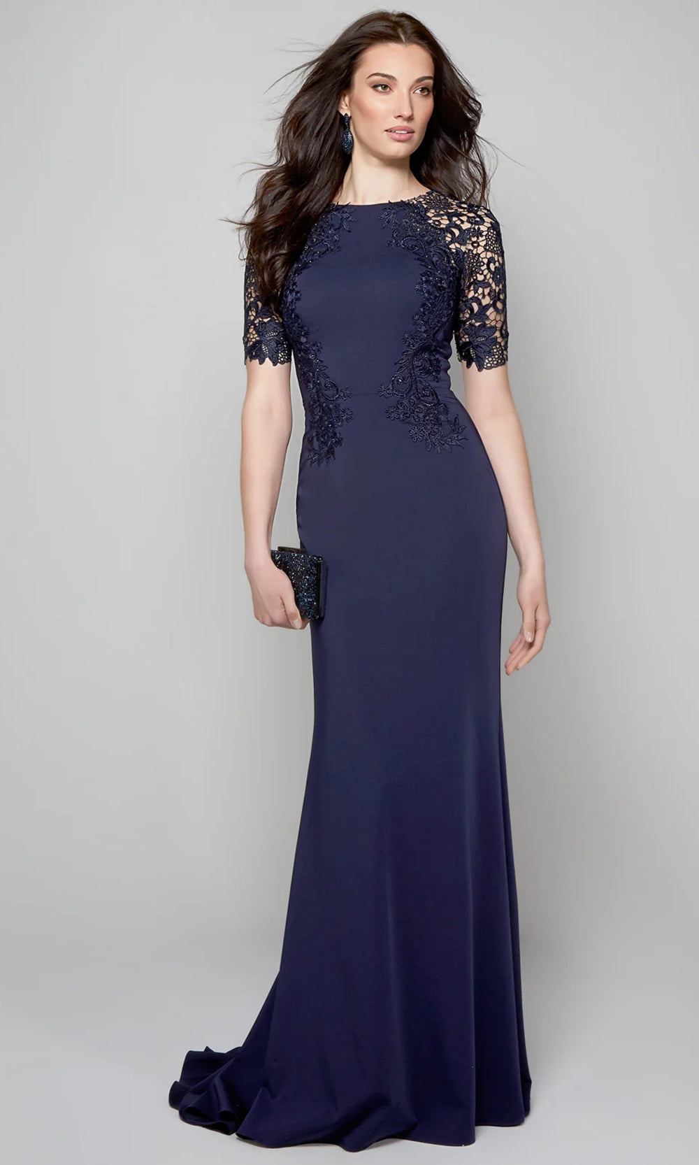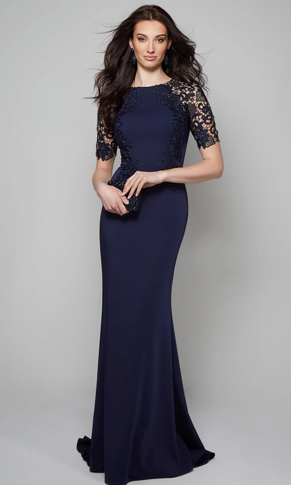 Alyce Paris 27585 effortlessly combines delicate embroidery and timeless elegance to create a lasting impression. Sheer short sleeves blend into a fitted bodice adorned with ornate lace embroidery that gives depth and texture. The sheath silhouette sculpts the figure gracefully, ending in a floor-length finish that enhances stature. With jewel neckline and partial illusion back, this design highlights feminine charm without excess. Alyce Paris 27585 is perfect for the woman who desires elegance through every element, from delicate fabrications to a silhouette that speaks in gentle volumes. Model is wearing Midnight color.