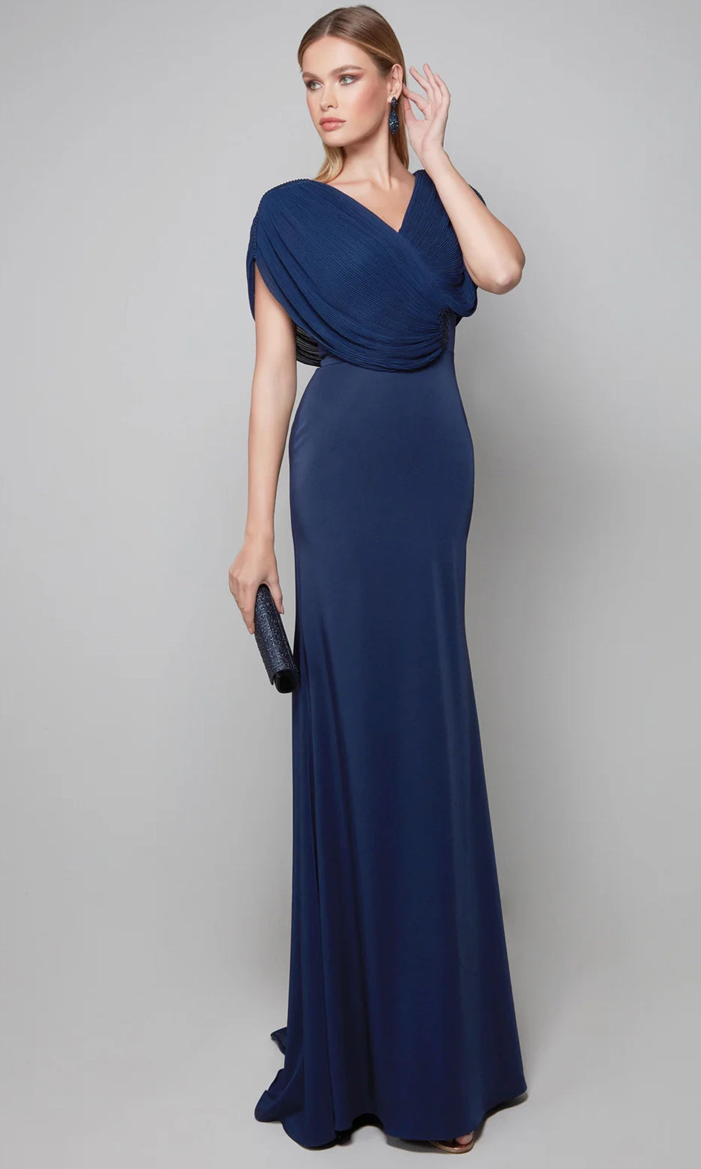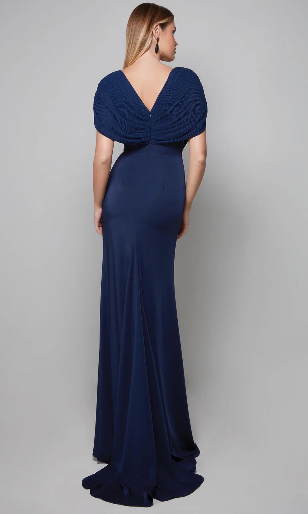 Embrace refined glamour in the Alyce Paris 27591, a sheath dress that blends timeless elegance with contemporary detail. Featuring a beautifully pleated bodice that softly wraps the upper body, this design offers short sleeves and a modest V-neckline that flatters without excess. The stretch crepe fabric skims the figure, flowing into a long hemline for an elongating effect. The midrise v-back closes with a discreet zipper, ensuring a seamless silhouette. Alyce Paris 27591 is a flawless match for those seeking understated sophistication. Model is wearing Midnight color.