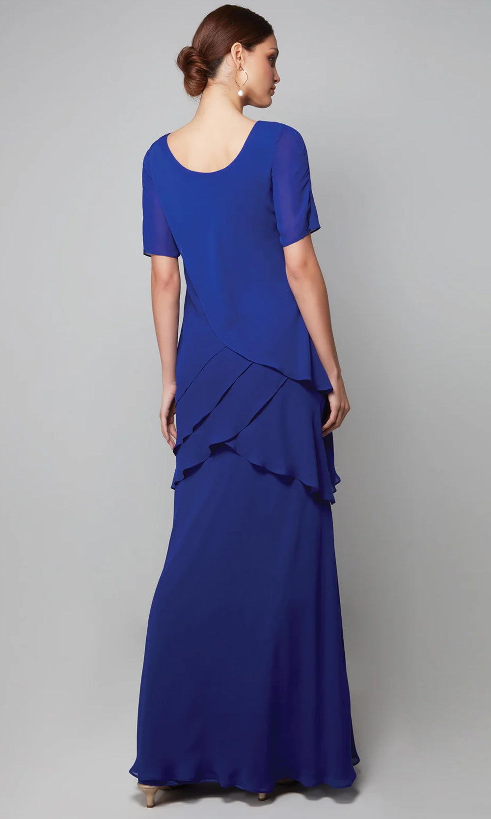 | Details: | Layered Bodice, Short Sleeves, Tiered Skirt, Scoop Back, Floor Length |