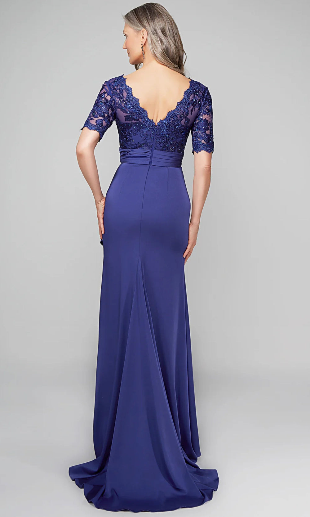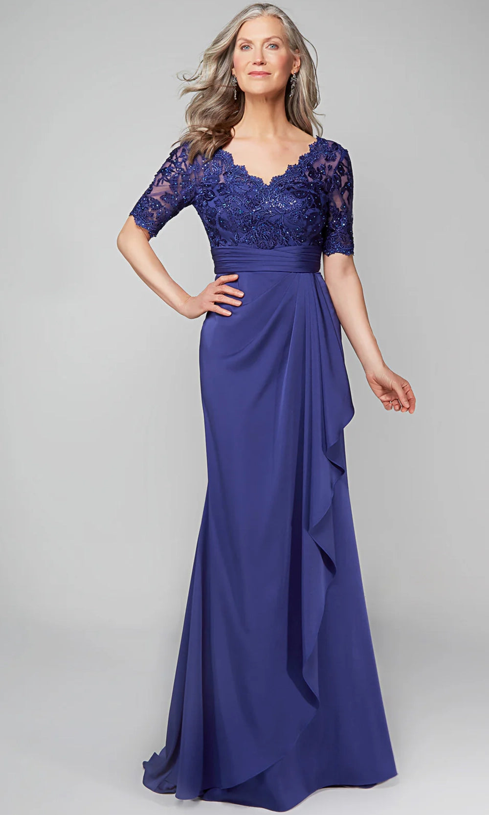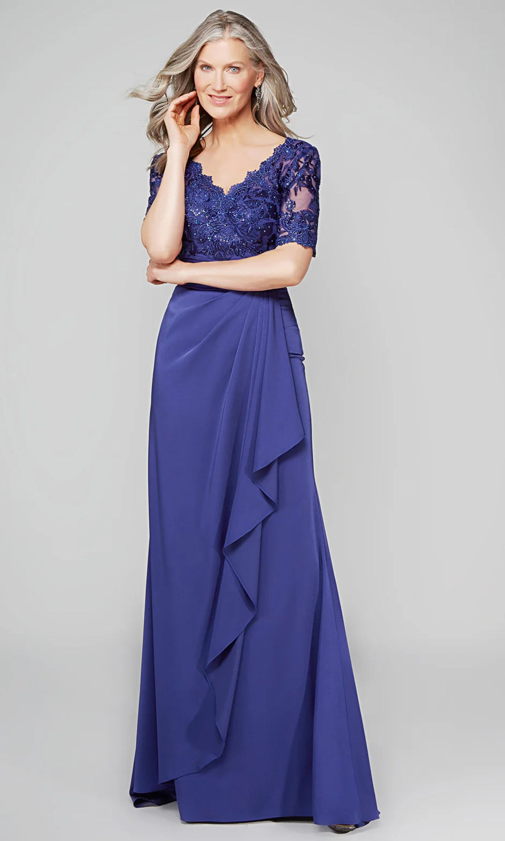 Step into timeless beauty in Alyce Paris 27595, an A-line gown that unites ethereal lace and softly draped crepe with stunning ease. The bodice features ornate floral lace appliques and beading that add depth and artistry, complemented by short sleeves that provide coverage without sacrificing style. A pleated waistband cinches the waist and drapes effortlessly over the flowing sheath skirt. With a scalloped V-neckline and midrise v-back, this piece presents a perfect combination of grace and comfort. Alyce Paris 27595 is a distinguished look for any sophisticated celebration. Model is wearing Navy color.