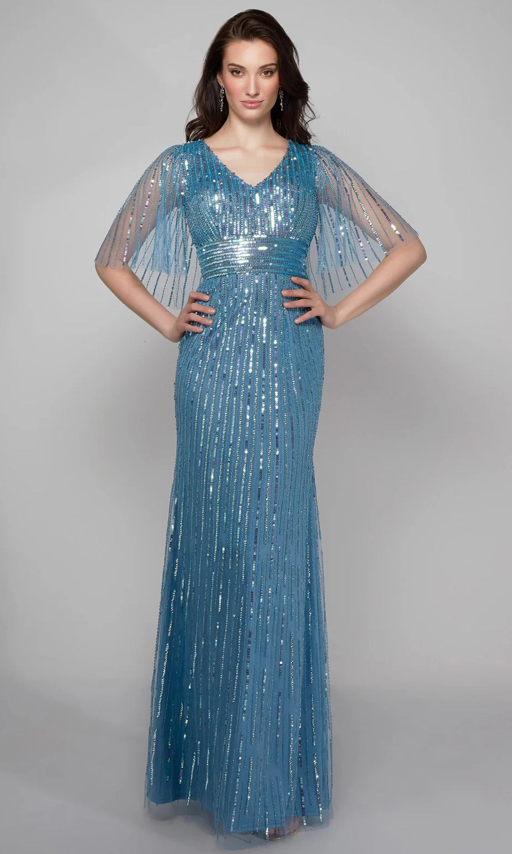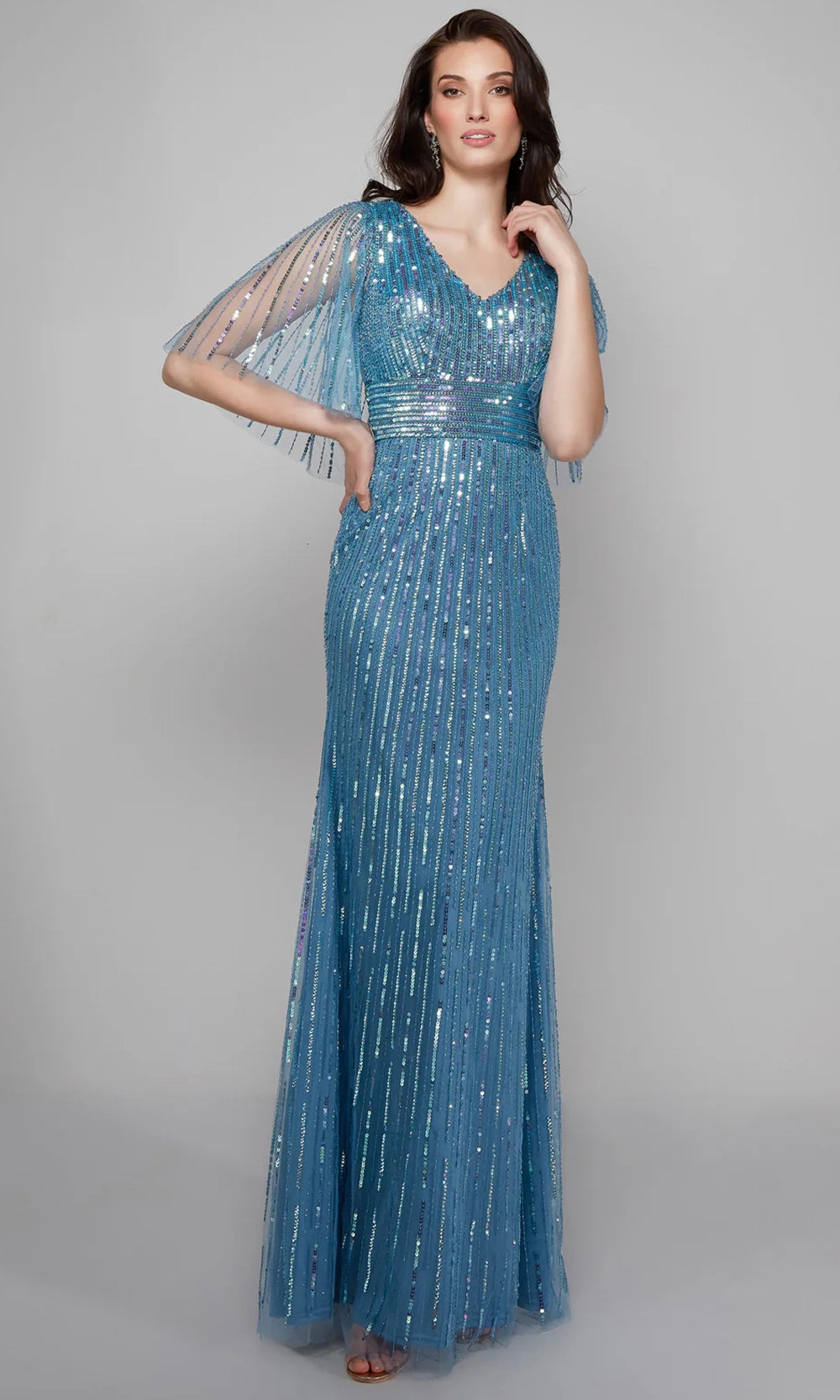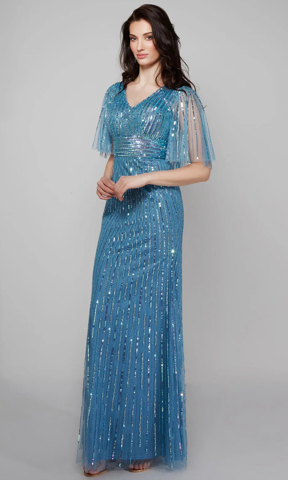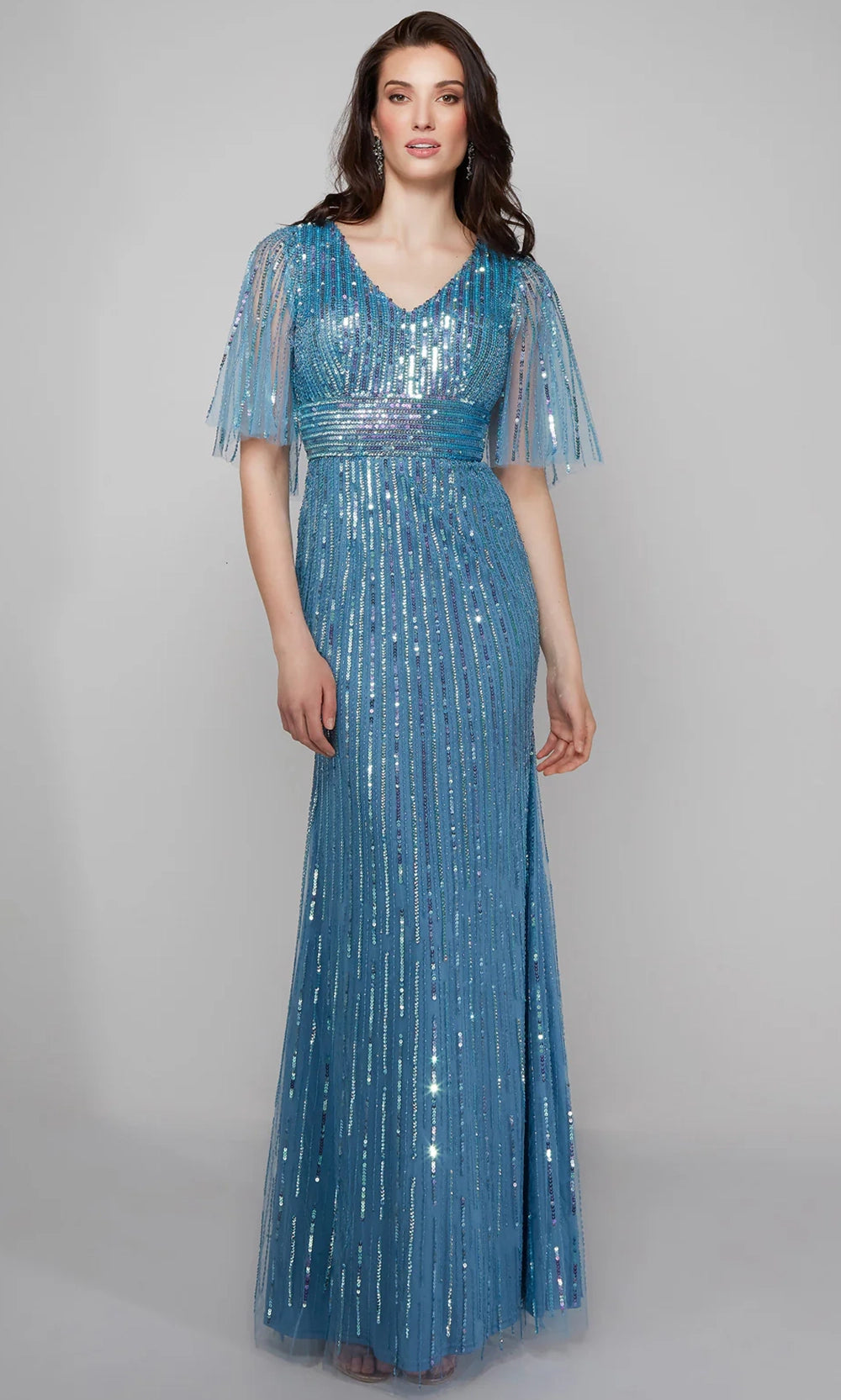 A graceful fusion of texture and shimmer defines Alyce Paris 27599, showcasing a fitted bodice with glimmering beaded linear embellishment. The short flutter sleeves lend a delicate charm, complementing the v-neckline and full back for a balanced, refined silhouette. The figure-enhancing ruched waistband draws attention to the natural waist while elongating the form for an effortlessly elegant appearance. This captivating sheath dress is perfect for those who appreciate timeless detailing and a silhouette that flatters from every angle. Alyce Paris 27599 embodies modern sophistication, crafted to leave a memorable impression at any elegant affair. Model is wearing Niagara Blue color.