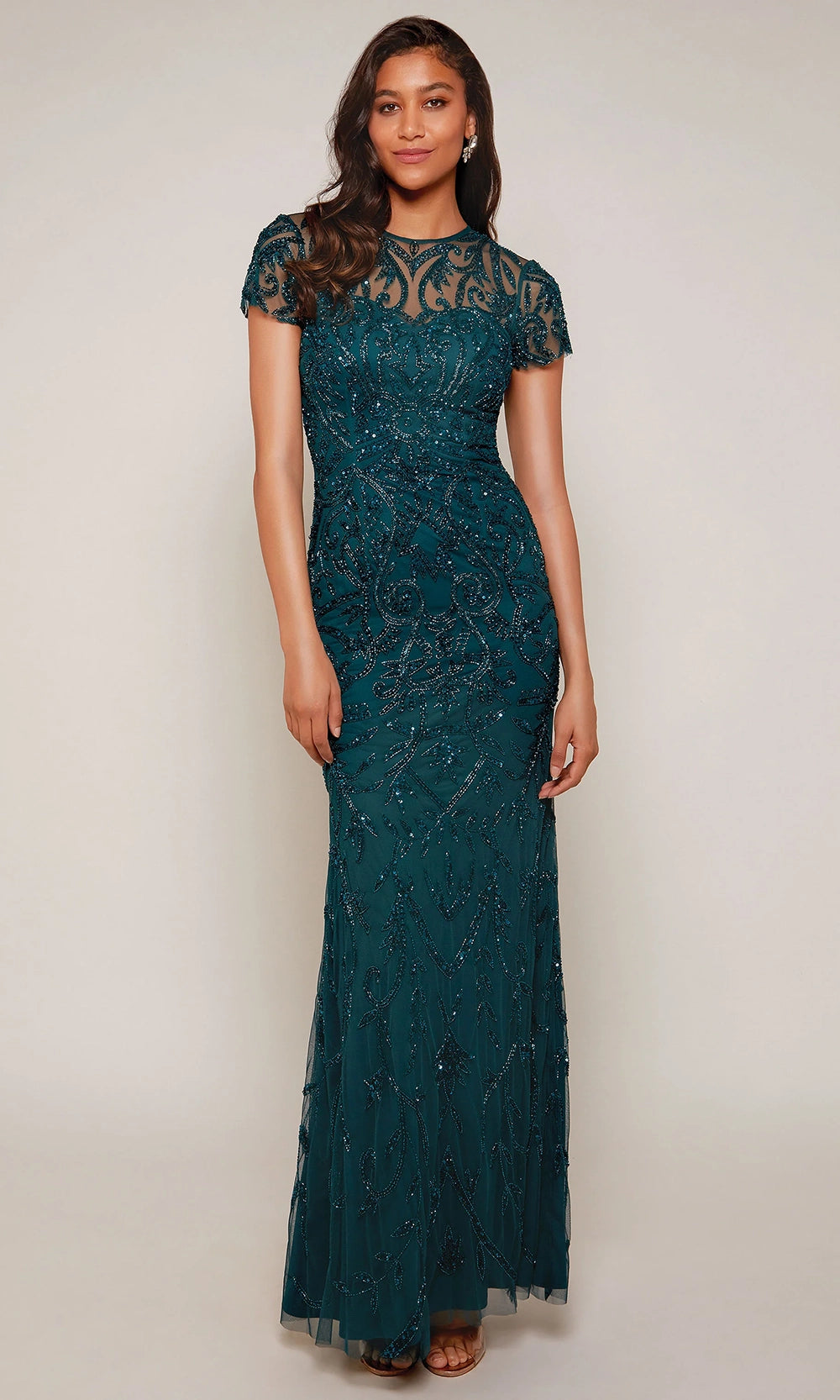 | Details: | Illusion Neckline, Short Sleeves, Fully Beaded Overlay, Keyhole Back, Fitted |