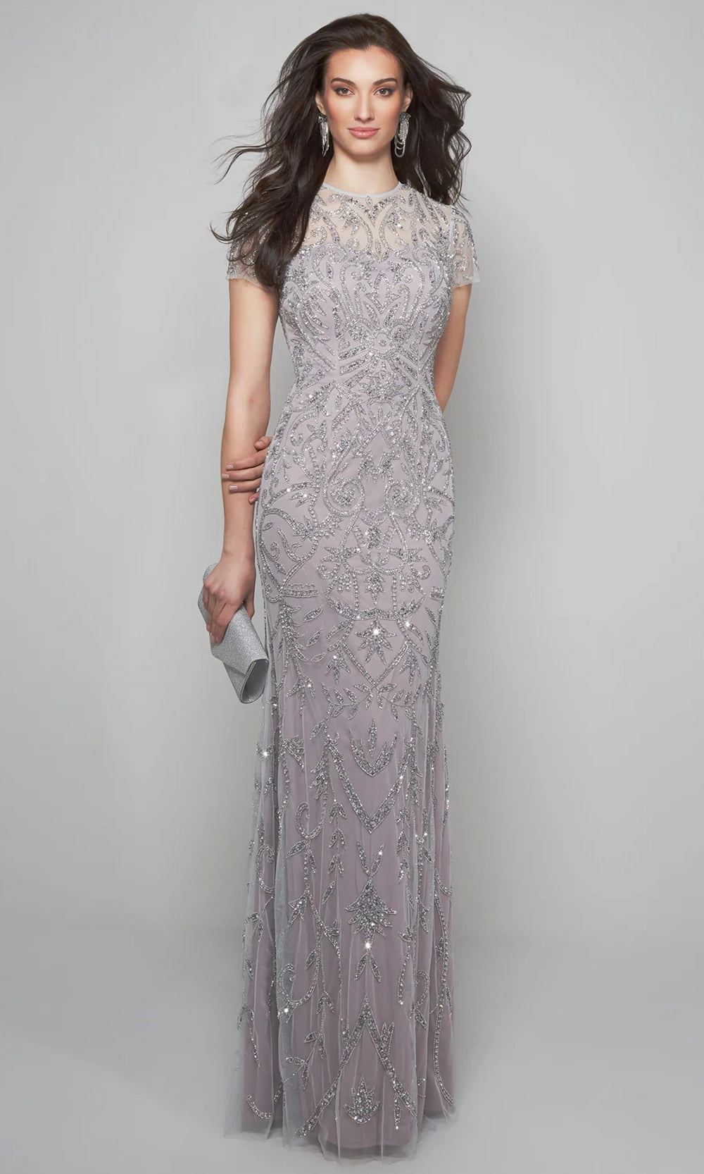 This standout design from Alyce Paris 27607, is a seamless blend of legacy-inspired charm and impeccable artistry. It features an illusion jewel neckline that adds subtle allure, beautifully paired with elegant short sleeves and keyhole back. Its figure-flattering sheath silhouette is layered with a beaded overlay that glistens with every movement. The intricate beading pattern flows gracefully across the bodice and skirt, while a concealed back zipper ensures a smooth finish. Whether you are attending a gala or formal reception, Alyce Paris 27607 brings unmatched sophistication and artistry to your evening look. Models are wearing Dragonfly, and Silver/Lilac colors.