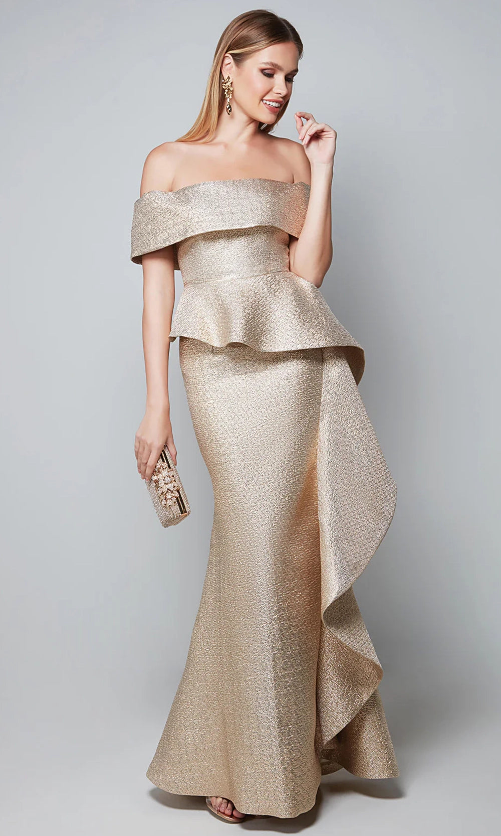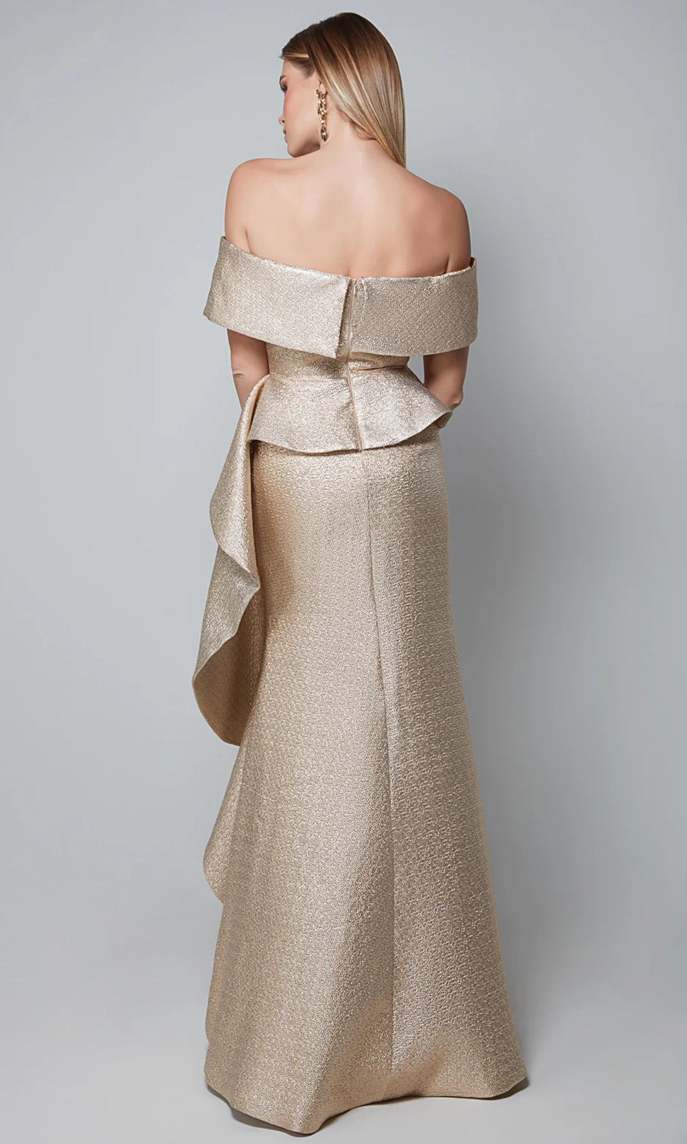 Refined with a bold twist, Alyce Paris 27612 features a sculptural silhouette designed to captivate. Its off shoulder sleeves and straight-across neckline with folded detail sets an alluring tone, while a structured peplum adds shape and energy at the waist. An asymmetrical ruffle detail cascades with elegant motion down the skirt, balancing texture and fluidity. Crafted from metallic jacquard, this sheath gown stands out with dimensional sheen and rich patterning. Step into Alyce Paris 27612 for a dramatic yet poised look that redefines contemporary glamour. Model is wearing Gold color.