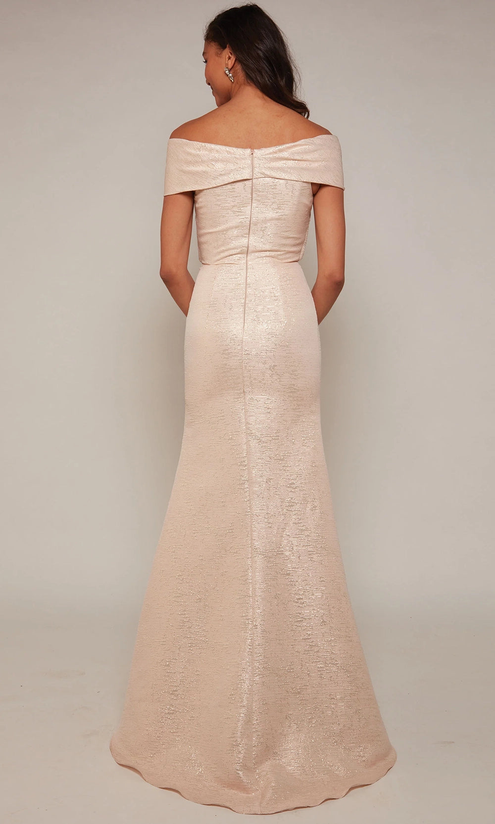 Feminine form meets modern structure in Alyce Paris 27613, a gown with polished confidence and timeless charm. The off shoulder neckline features a twisted detail that adds sculptural volume and visual intrigue. Crafted in metallic jacquard, the gown shimmers with every step while offering subtle texture and depth. Its sheath silhouette hugs the curves and flares at the full-length hem, enhancing movement and grace. Alyce Paris 27613 is a sophisticated choice for formal moments where elevated design is key. Models are wearing Champagne-Gold, Light Coral/Gold, and Sea Glass colors.