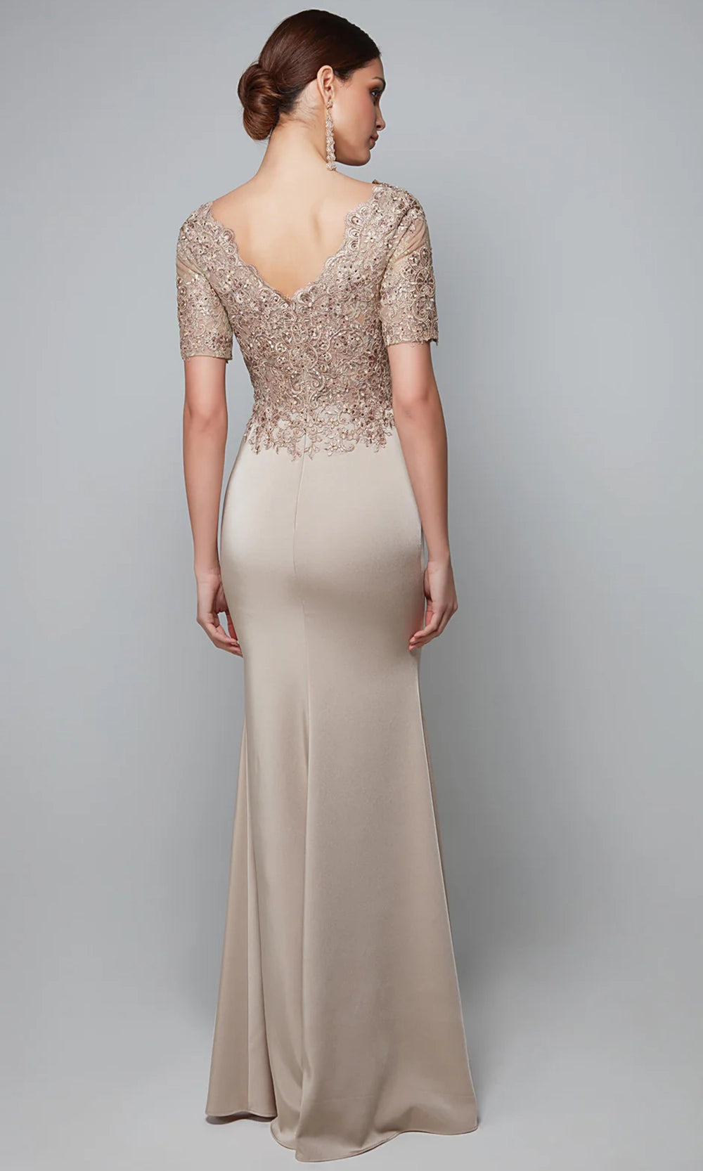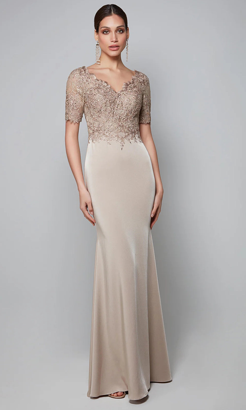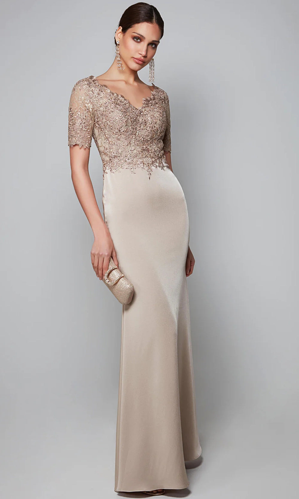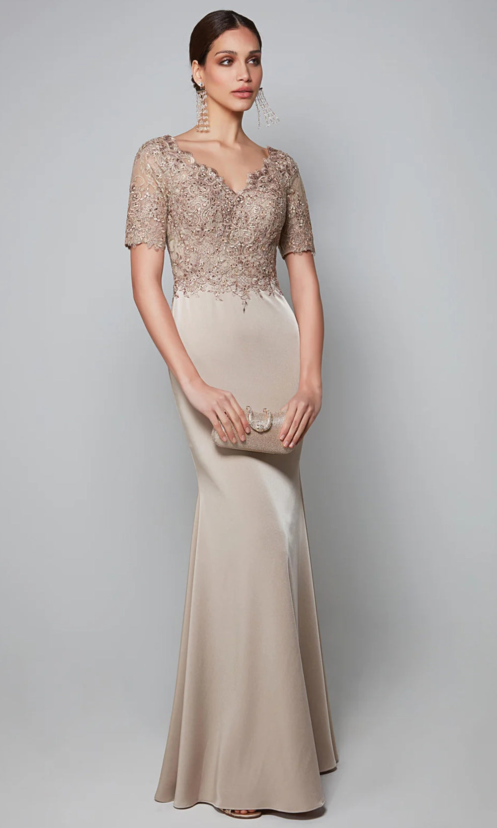 Elegance flourishes in the refined beauty of Alyce Paris 27615 where timeless details define the silhouette. Featuring a sophisticated scalloped trim, V-neckline and intricate beaded lace bodice, this style embraces a graceful profile with its crepe sheath skirt. Short sleeves provide subtle coverage while the natural waistline offers a tailored, flattering shape. A concealed back zipper ensures a seamless finish. Complete your formal wardrobe with Alyce Paris 27615 and experience the perfect blend of tradition and modern charm in one unforgettable piece. Model is wearing Almondine color.