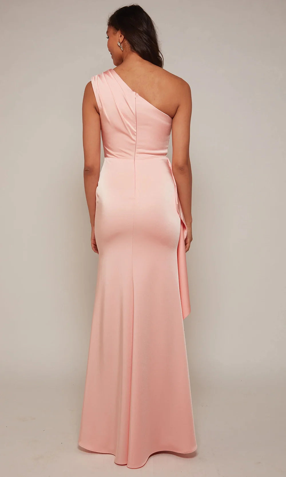 One Shoulder Wide Strap, Ruched Bodice, Side Draping, Back Zipper, Fitted |