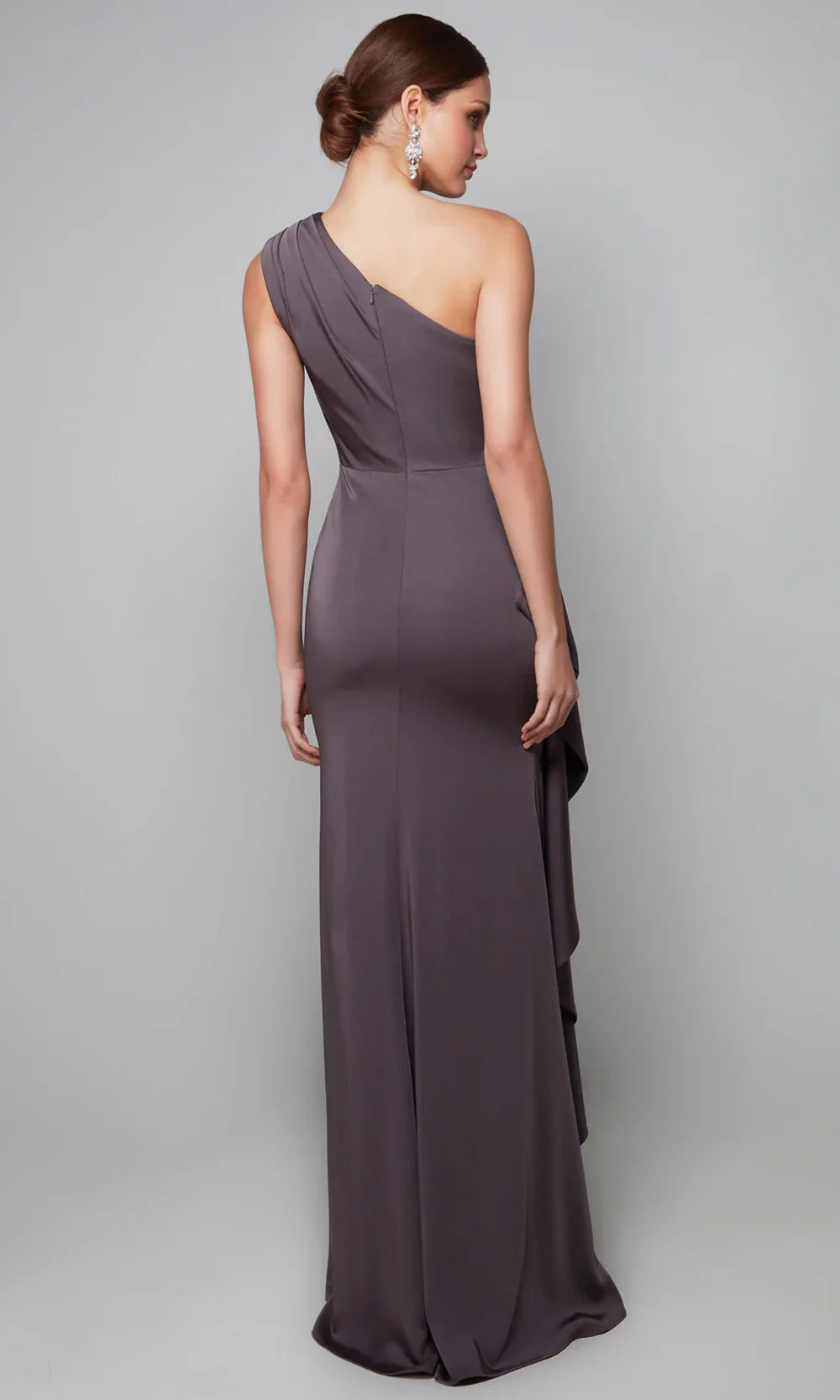 Enter the evening with refined elegance in the Alyce Paris 27624 gown. This one-shoulder masterpiece features a sleek sheath silhouette that drapes beautifully over the body. Subtle ruching and side gathers bring soft dimension, while the asymmetrical neckline adds a touch of modern artistry. Perfect for galas or sophisticated celebrations, this gown embodies quiet confidence and contemporary style. Step into your night with effortless poise in Alyce Paris 27624.