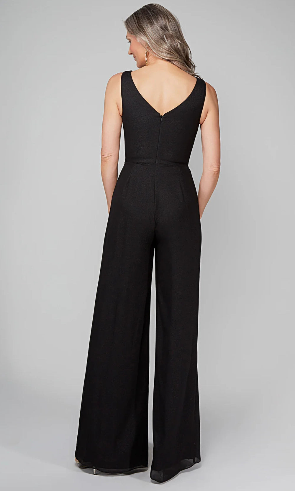 Step into sophisticated ease with the Alyce Paris style 27633, a chic pants ensemble designed to offer both comfort and elegance. Featuring a soft chiffon overlay top with flutter sleeves, this look pairs beautifully with wide-leg pants for graceful movement. The sleeveless inner jumpsuit provides structure underneath, while the flowing asymmetrical top creates a flattering silhouette. Perfect for women who want luxury without sacrificing comfort, this outfit transitions seamlessly from formal celebrations to evening gatherings. Choose Alyce Paris style 27633 for your next special event and enjoy timeless elegance with effortless wear. Model is wearing Black color.