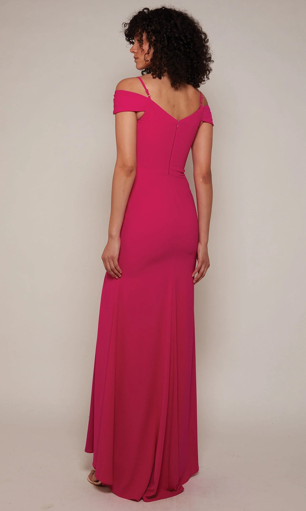 Alyce Paris 27645 long gown blends contemporary charm with a soft romantic touch through its fitted silhouette and detailed bodice. Cold shoulder sleeves and adjustable spaghetti straps frame the v neckline, offering delicate coverage and balance. A beaded accent draws focus to the waist, while the smooth sheath skirt opens into a front slit for graceful movement. The fitted design enhances the figure while maintaining a clean and elegant line. Designed for subtle glamour, Alyce Paris 27645 style brings classic femininity into a sleek and polished shape. Model is wearing Hot Pink color.