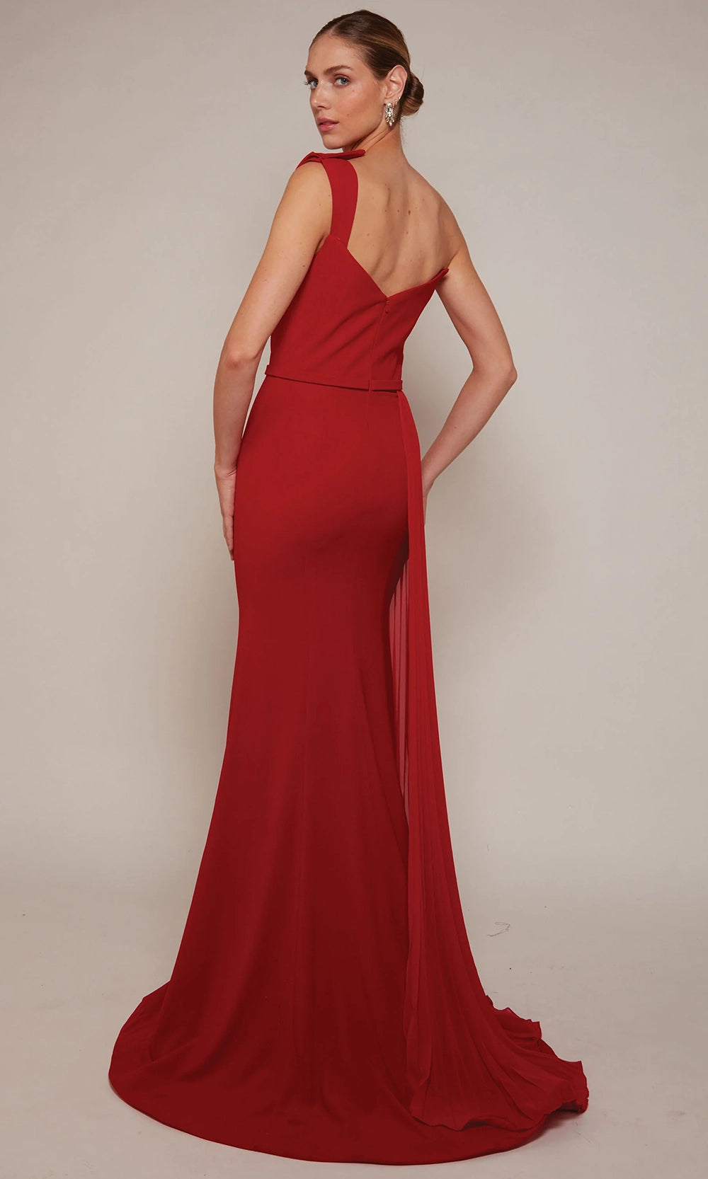 A modern statement of elegance, Alyce Paris 27650 gown features asymmetrical details blended with soft movement. It features a romantic asymmetric neckline paired with one shoulder wide strap and open back. A sculpted side overskirt rich with pleats, extends into a grand train for a breathtaking effect. Beaded detailing peeks through the structured fold, creating subtle contrast and visual texture. This design transitions seamlessly into a fitted sheath silhouette with a high slit, offering both structure and fluidity. From its sculptural lines to the artful layering, Alyce Paris 27650 style is crafted to elevate your formal wardrobe with grace and originality. Model is wearing Red color.