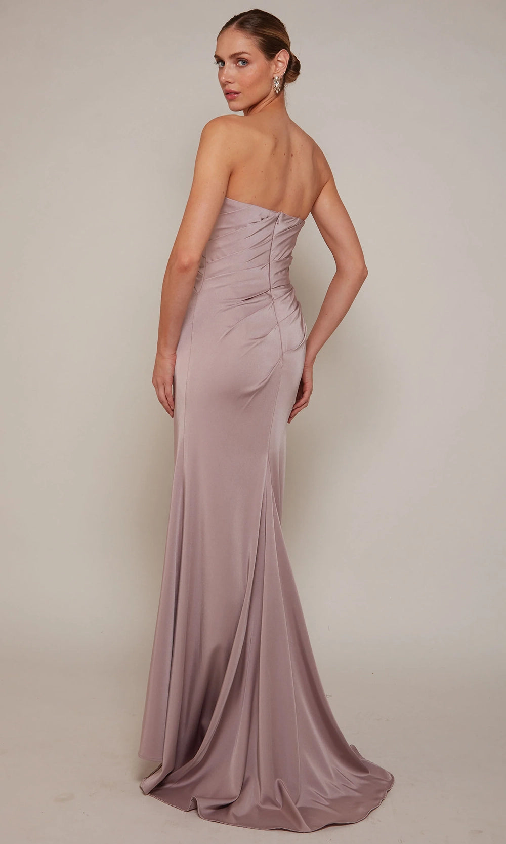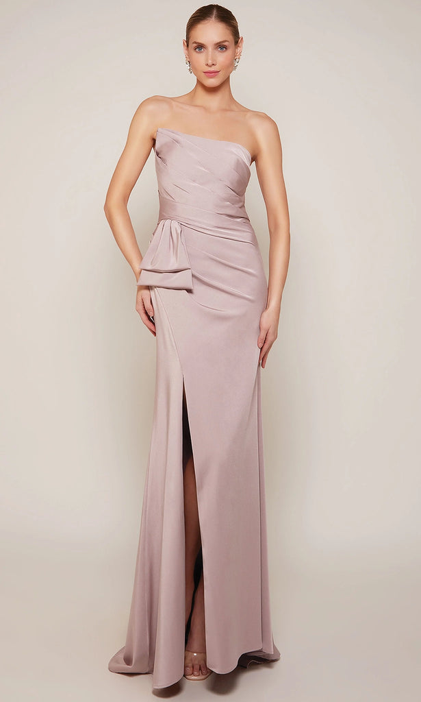 Minimalist tailoring finds expression in Alyce Paris 27658, where each detail serves both form and function. The strapless asymmetric neckline is clean and modern, leading into a ruched bodice that wraps gently around the waist. The one-sided peplum detail layers the look with softness and visual intrigue. The sheath skirt is fitted and balanced by a front slit that ensures graceful ease of movement. With an emphasis on proportion, shape, and quiet sophistication, Alyce Paris 27658 gown embodies poised elegance in every line. Model is wearing Rosewood color.