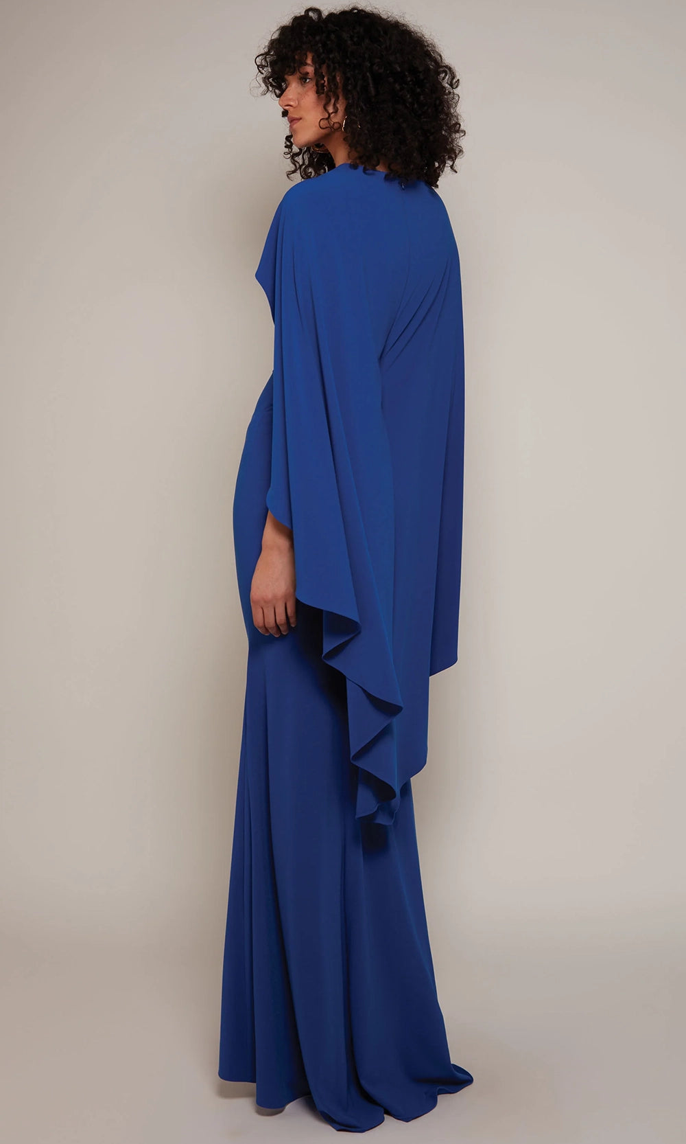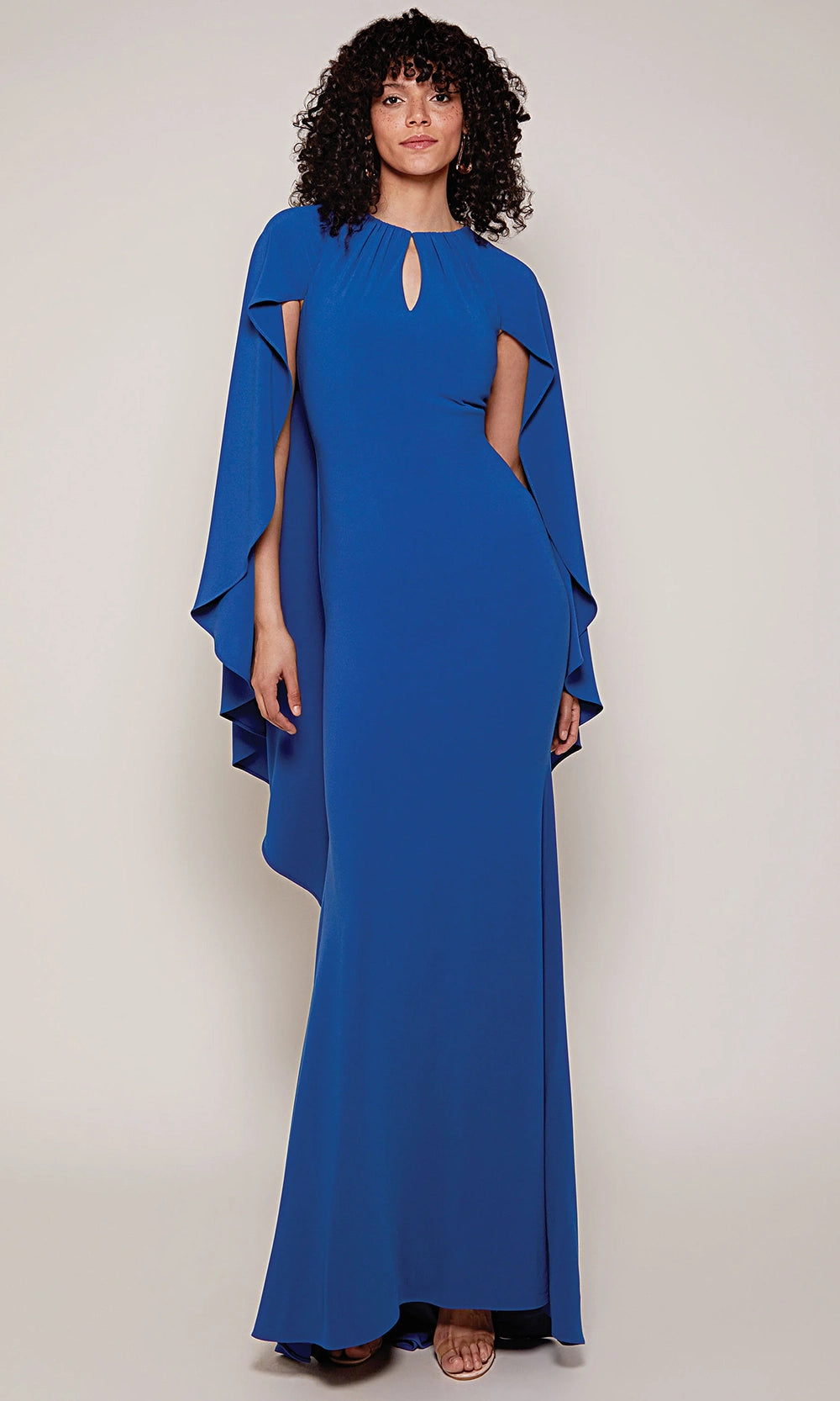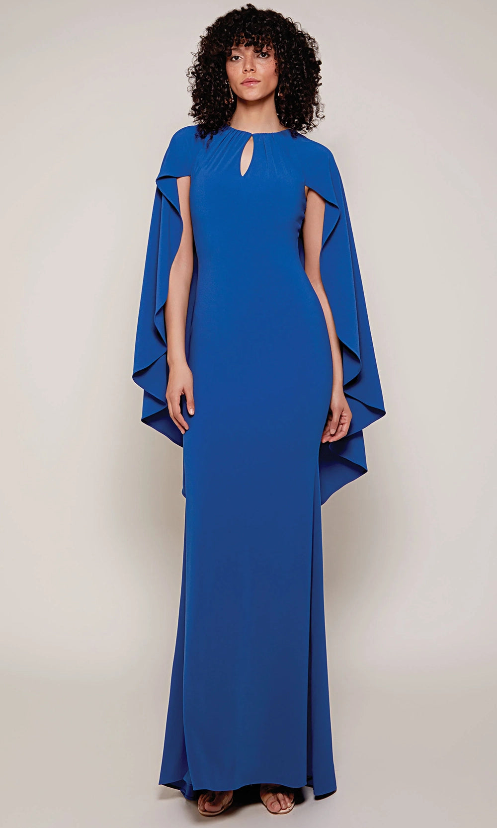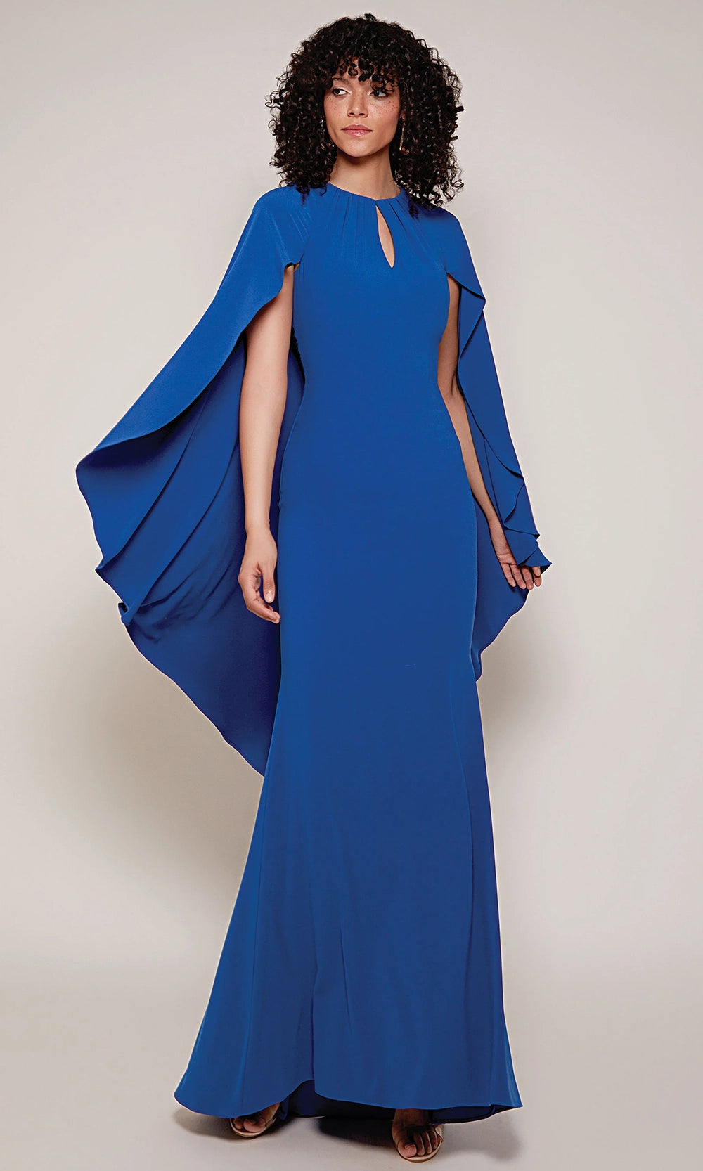All eyes will be on you in the Alyce Paris 27683 long gown. It introduces flowing cape sleeves to a streamlined silhouette, resulting in an effortlessly poised design. A front keyhole provides contrast to the structured high neckline, maintaining elegance and proportion. From the natural waist, the gown continues in a clean sheath line, elongating the frame while the cape sleeves add dramatic dimension. Crafted for elegance and comfort, Alyce Paris 27683 style delivers an elevated yet fluid eveningwear option with striking simplicity. Model is wearing Royal color.