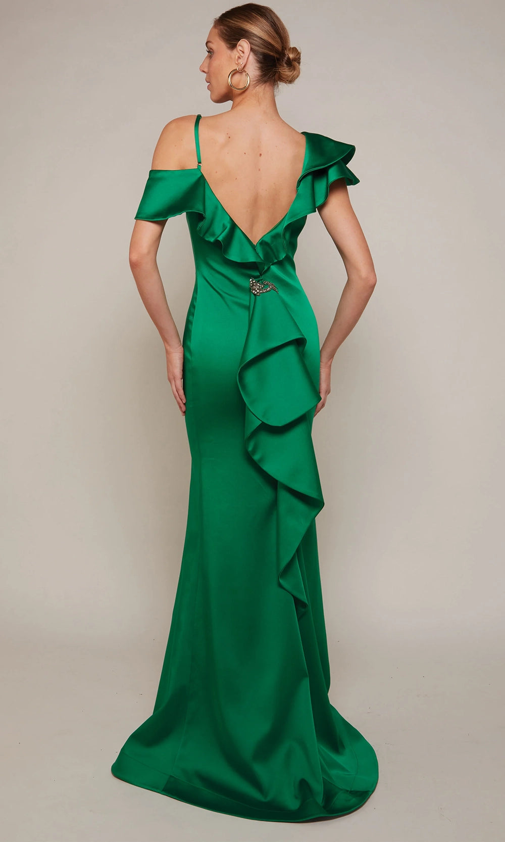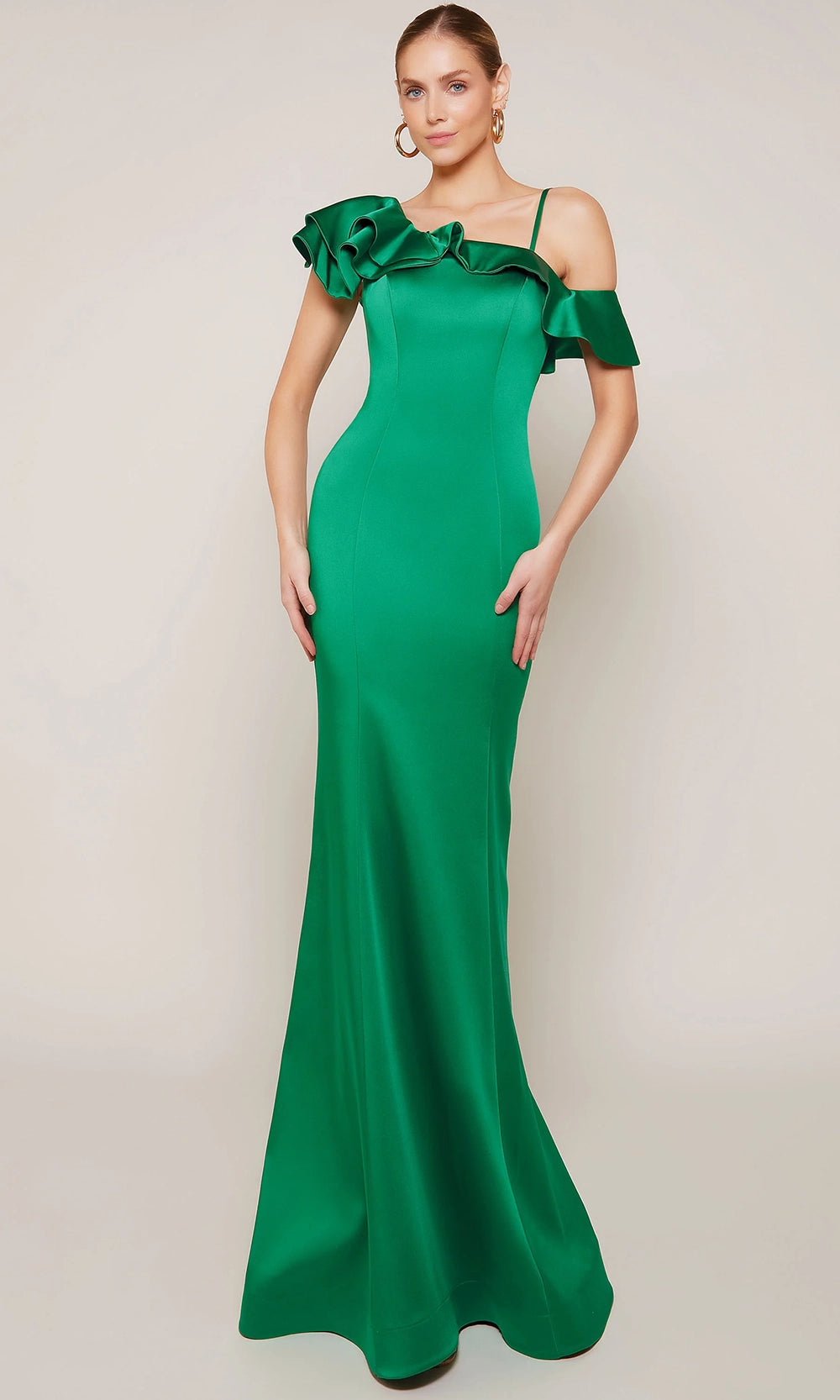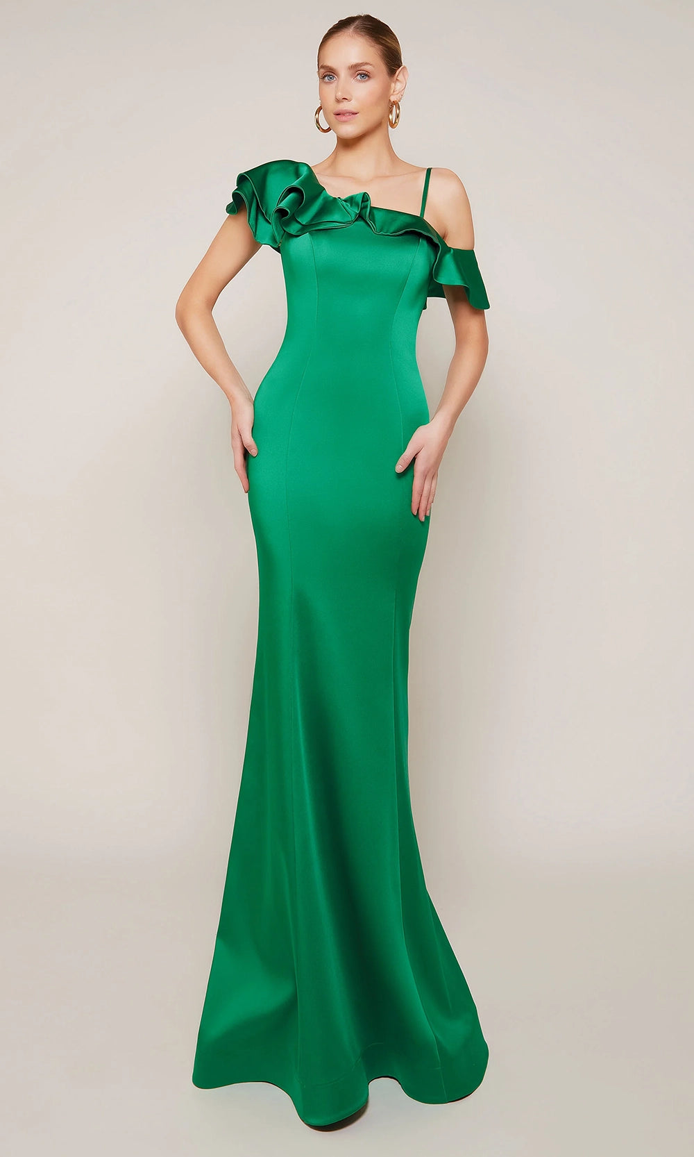 Channel show-stopping elegance in the Alyce Paris 27691 dress that makes a lasting impression. The asymmetric neckline has cap sleeves and single adjustable spaghetti strap that offer both support and style. A sculpted bodice leads into a sheath skirt with a gentle flare and elegant sweep train. The standout feature is the cascading ruffle that graces neckline and v-open back, bringing dramatic dimension. The luminous satin fabric complements the form with fluid sophistication, while the back zipper secures a flawless fit. Alyce Paris 27691 effortlessly blends modern design and graceful silhouette for a striking evening look. Model is wearing Emerald color.