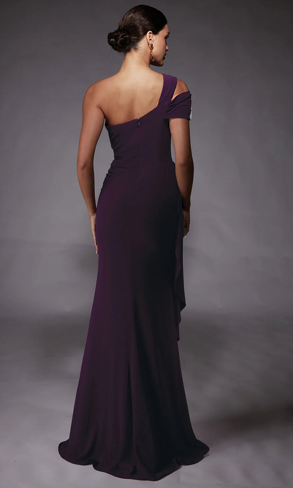 Be the standout in any room by wearing this Alyce Paris 27705 masterpiece. The beautifully tailored gown in sumptuous Italian knit offers an asymmetric neckline and cold shoulder sleeve enhanced with elegant fold-over detailing. The sheath silhouette gracefully glides over curves, while the dramatic side drape introduces movement and asymmetry. Crafted to feel as comfortable as it is captivating, this full-length style merges structure with a soft, flowing presence. Another great creation by Alyce Paris 27705. Model is wearing Eggplant color.