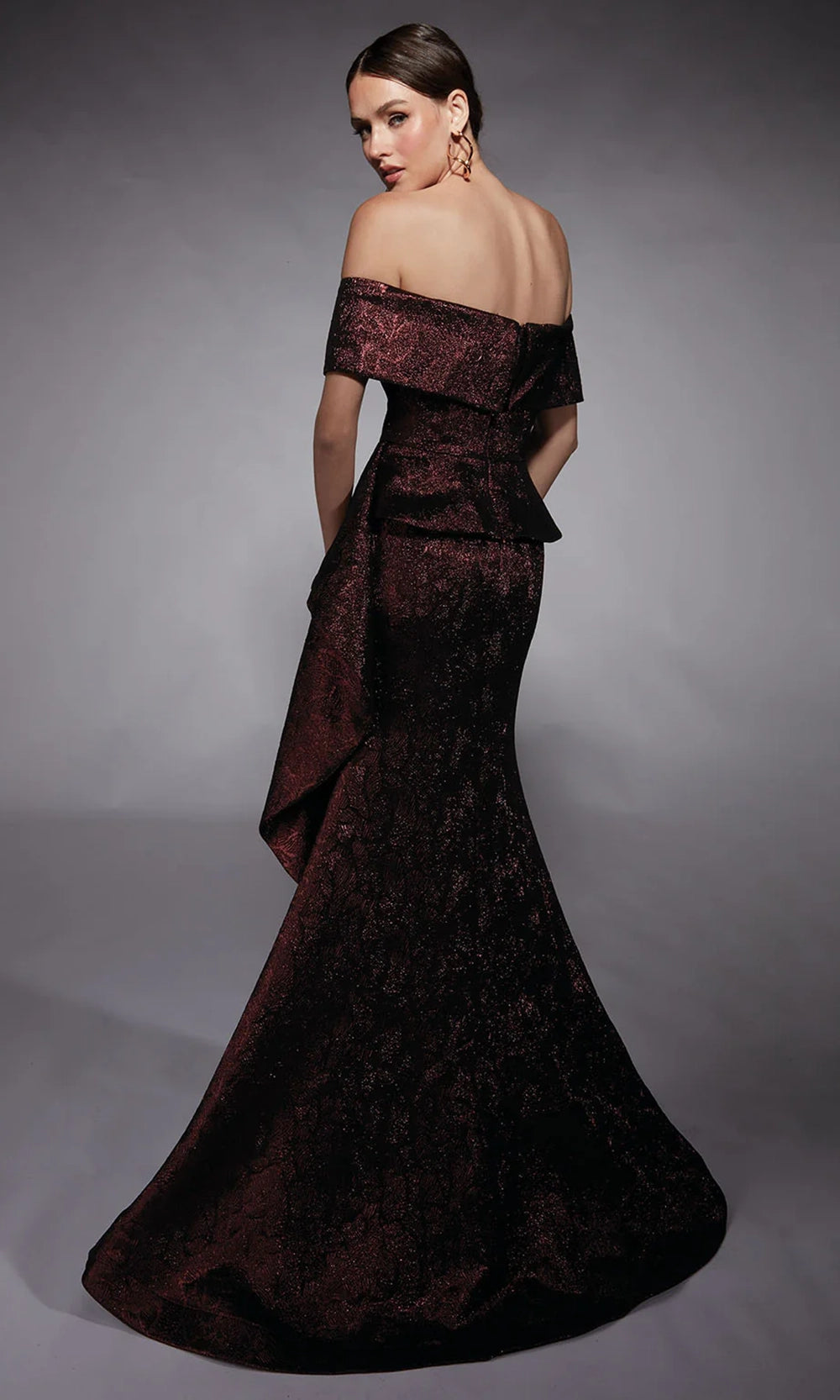 Striking in its sculptural appeal, this Alyce Paris 27707 off-shoulder gown captures timeless drama with a structured bodice and a rich jacquard texture that commands attention. The layered peplum detail defines the waist and flows seamlessly into a figure-enhancing mermaid silhouette, while the elegant side drape adds movement and architectural interest. The structured bodice complements the flared hem, creating a statuesque profile ideal for elevated formal occasions. This Alyce Paris 27707 design balances bold tailoring with feminine elegance, offering a confident presence from every angle. Model is wearing Burgundy color.