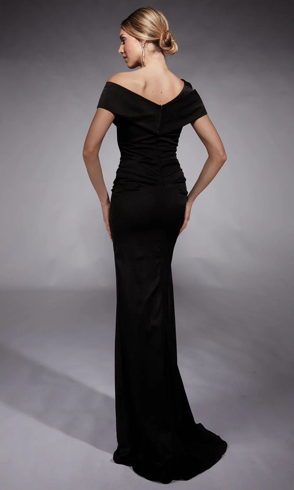 Defined by elegant structure and modern refinement, Alyce Paris 27710 is a striking dress that captivates with every detail. The carefully folded asymmetric shoulder neckline and cap sleeves brings sculptural charm, gracefully framing the shoulders and collarbone. A fitted bodice seamlessly transitions into a fitted sheath skirt that drapes to the floor sweeping train with timeless sophistication. Subtle ruching and a tailored silhouette offer balance, creating a graceful and commanding presence. With thoughtful construction and a flattering shape, Alyce Paris 27710 style is designed for those who appreciate confident elegance. Model is wearing Black color.