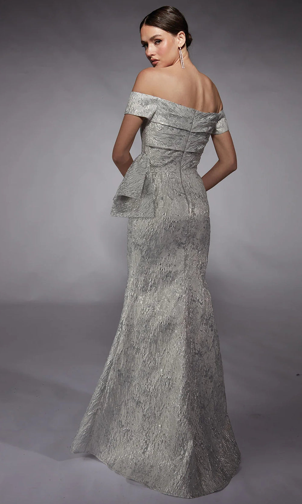 Step into pure evening glamour with the Alyce Paris 27717 style. Off-shoulder asymmetric neckline and cap sleeves creates a flattering frame, leading into a delicately ruched bodice that emphasizes the natural waist. The long sheath skirt is enhanced by a side bow drape and thigh slit, offering graceful movement and allure. Expert tailoring ensures a sleek silhouette that highlights form without excess. Alyce Paris 27717 jacquard dress blends modern construction with timeless charm for a look that captures polished sophistication at every angle. Model is wearing Silver color.