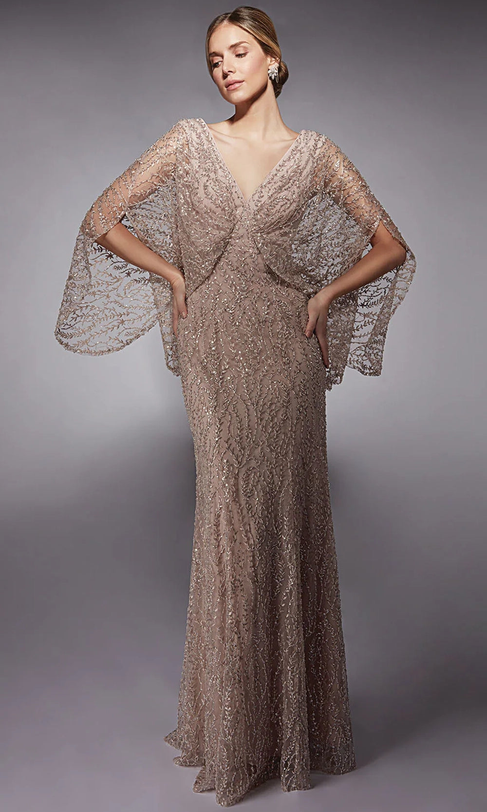 The refined aesthetic of Alyce Paris 27724 is effortlessly conveyed through its delicate design and luxurious detail. Featuring a soft V-neckline and flowing cape sleeves, this dress drapes gracefully along the body. The intricate sequin embroidered pattern adds dimension and texture, lending a gentle sparkle with every movement. A figure-skimming sheath silhouette enhances the natural shape while providing comfort and ease. Ideal for those seeking a classic yet fresh evening option, Alyce Paris 27724 brings together grace, glamour, and timeless appeal in one beautiful look. Model is wearing Sultry Blush color.