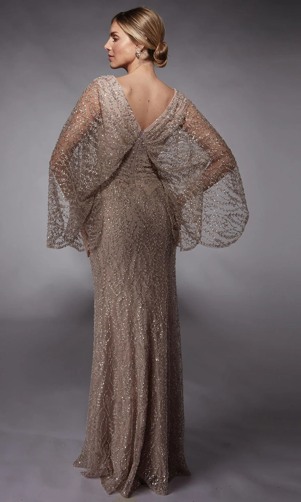 | Details: | Sheer Cape Sleeves, Sequin Embroidery, V-Shaped Back, Fitted Bodice |