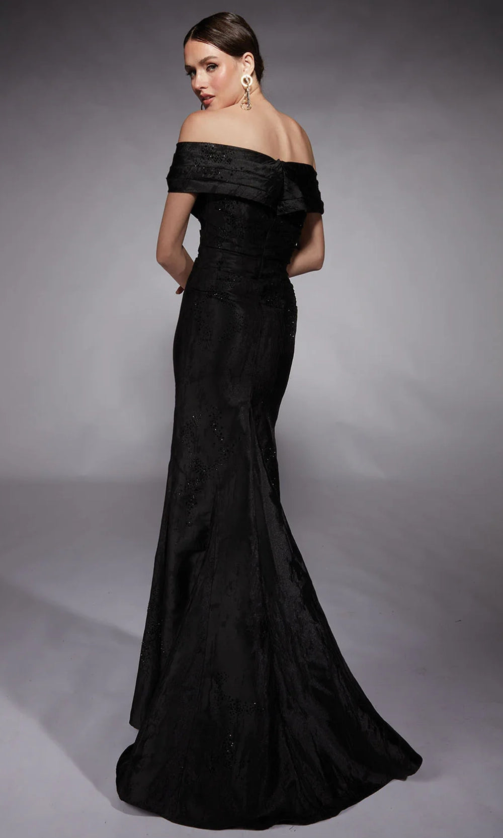 Embrace refined simplicity with this Alyce Paris 27733 stunner that gracefully enhances every curve. The dress is defined by its sculpted mermaid silhouette, subtle beaded shimmer, and sophisticated design. Delicate pleating along the bodice adds a touch of dimension, while the off-shoulder neckline and short sleeves gives a timeless touch of allure. This piece is tailored for those who appreciate minimalism elevated by luxurious texture. With Alyce Paris 27733, sophistication meets elegance in a way that is both effortless and undeniably striking. Model is wearing Black color.
