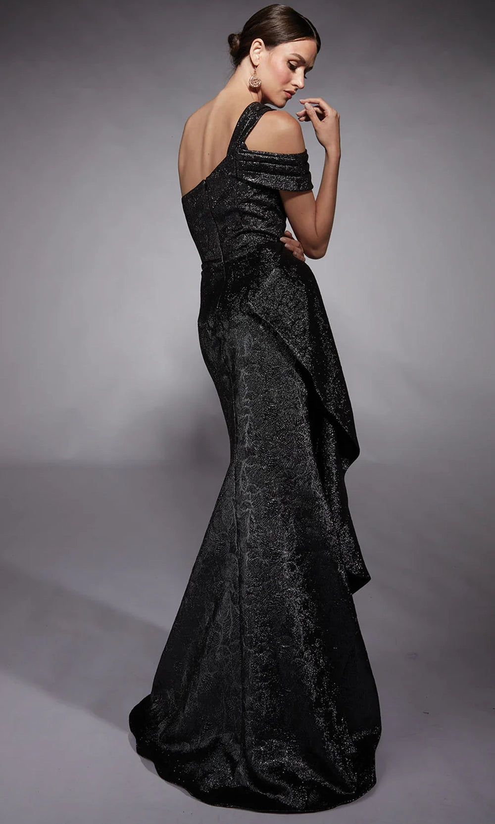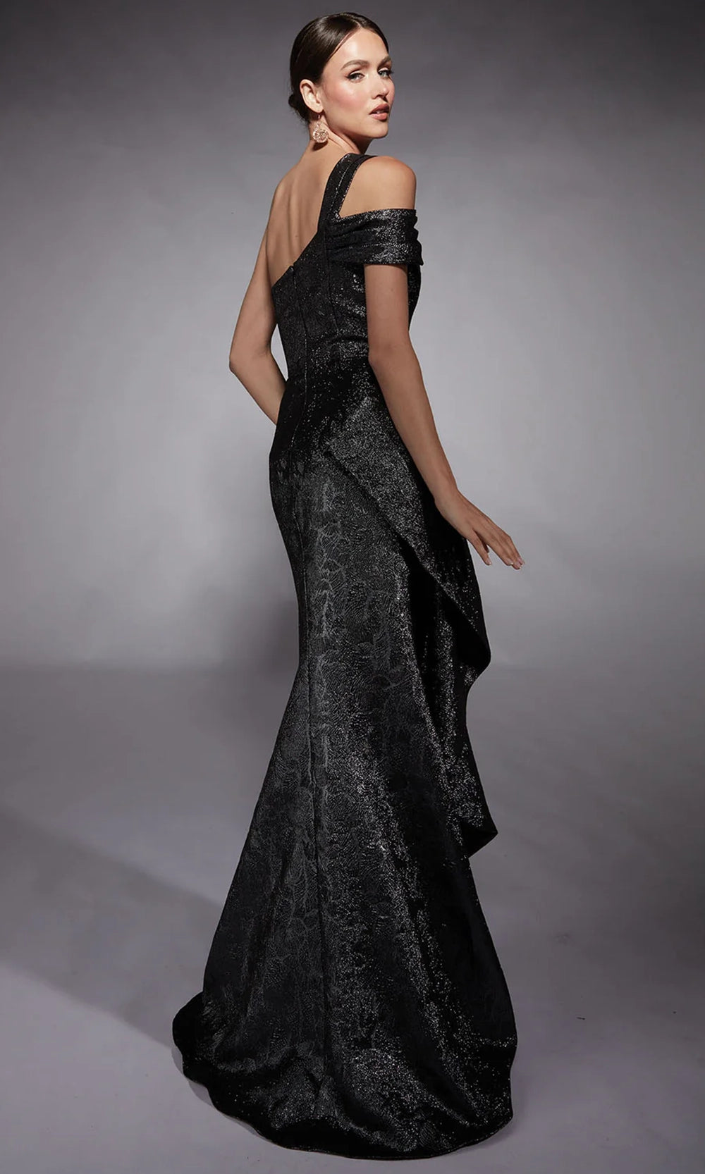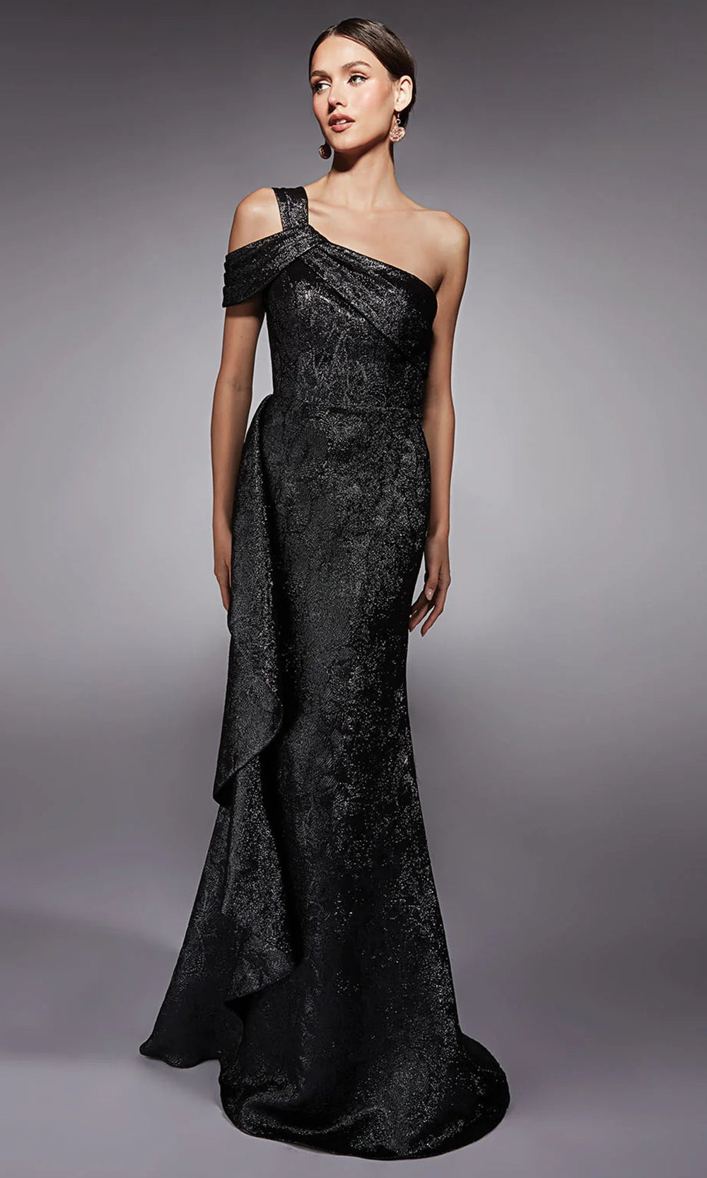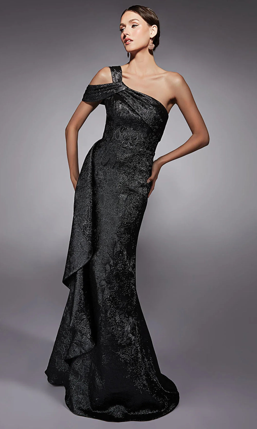 A sculptural silhouette meets dramatic flair in this unforgettable Alyce Paris 27734 gown. The jacquard ensemble features a unique asymmetric neckline and cold shoulder sleeve, enhancing the bold single-shoulder design that frames the bodice beautifully. Side ruffle overlay cascades gracefully, complementing the sheath silhouette and creating movement with every step. A sweep train lends a touch of elegance to the overall look. Back zipper closure ensures a seamless fit, making this gown a refined choice. Make a striking entrance in the Alyce Paris 27734 and experience effortless sophistication. Model is wearing Dripping Diamonds (Silver) color.