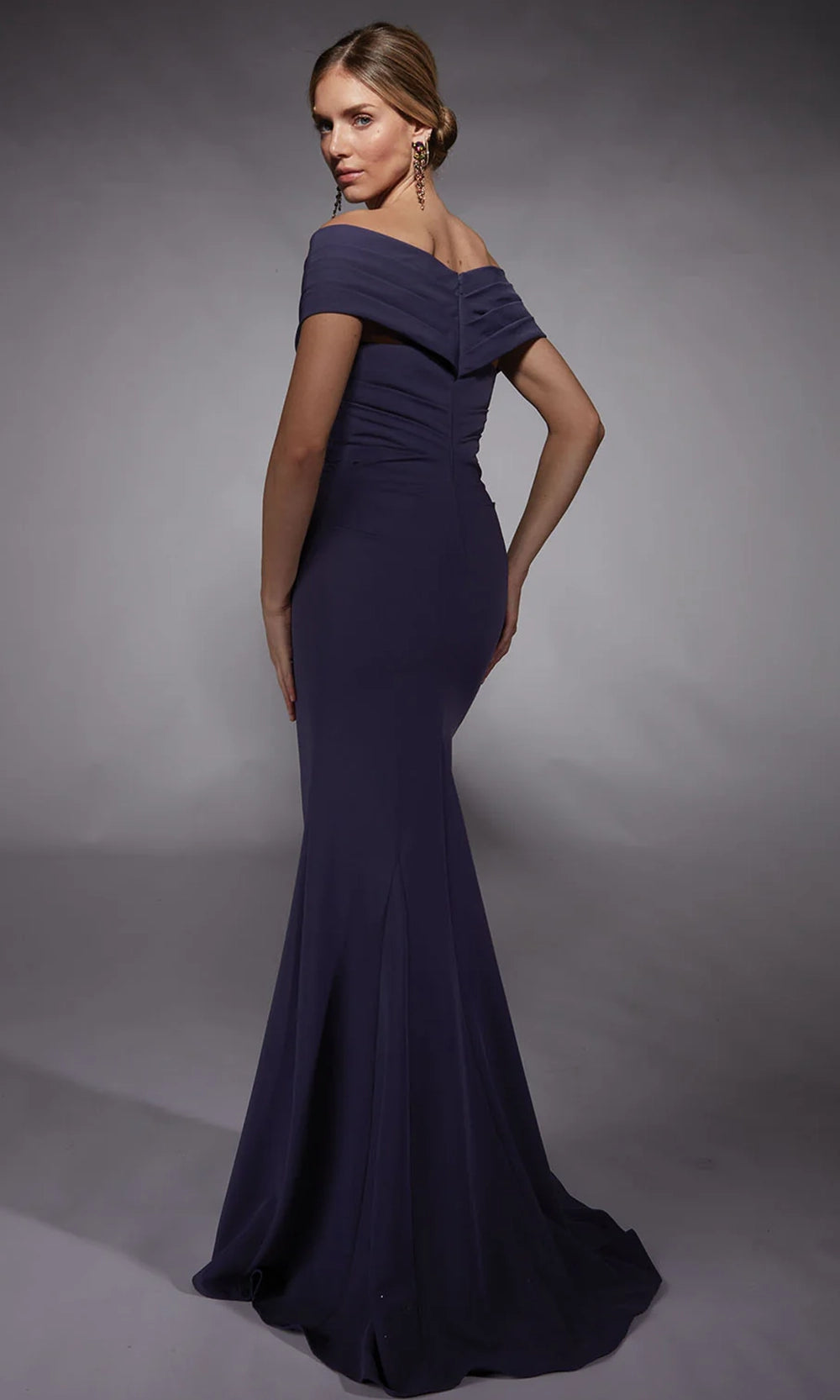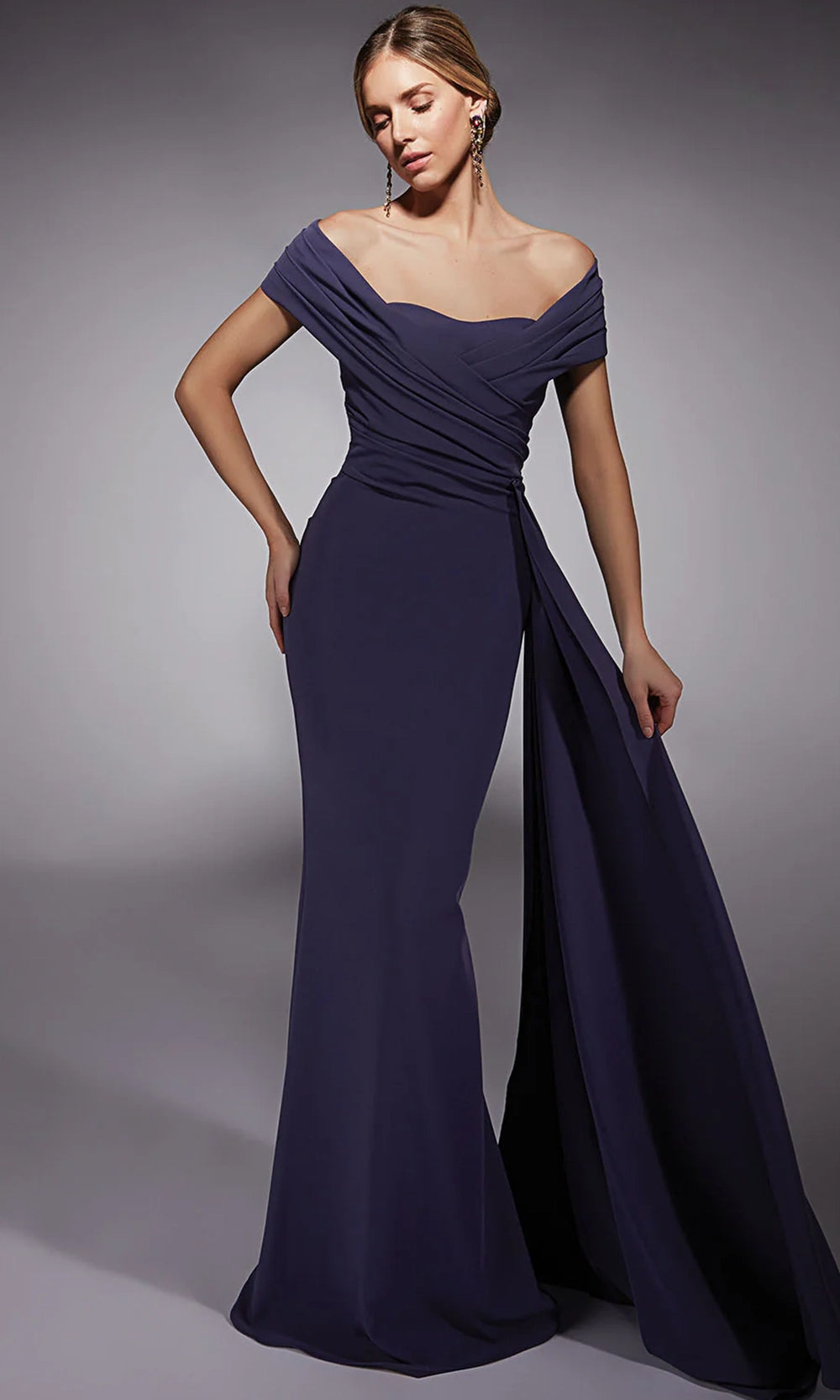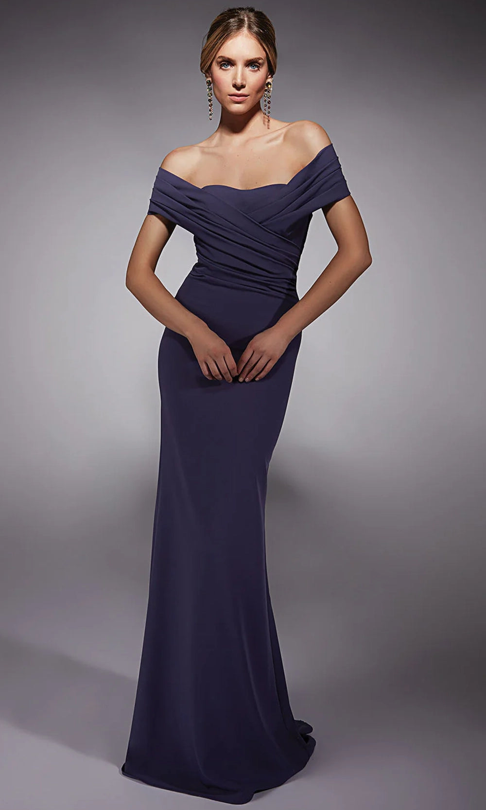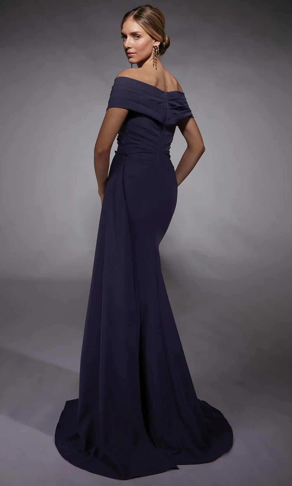 Leave a timeless impression in the Alyce Paris 27745 dress that captures the essence of graceful elegance. It showcases timeless beauty through a ruched bodice that enhances natural curves while remaining sleek and polished. Its fitted sheath silhouette follows the body gracefully, creating a statuesque effect that feels both powerful and feminine. The off-shoulder short sleeves and straight across neckline adds a romantic frame, ideal for highlighting decolletage. The look is elevated with a side overskirt that detaches with ease, flowing into a soft train that trails behind beautifully. Alyce Paris 27745 ensures you do so with quiet sophistication and contemporary poise. Models are wearing Grape, and Midnight colors.