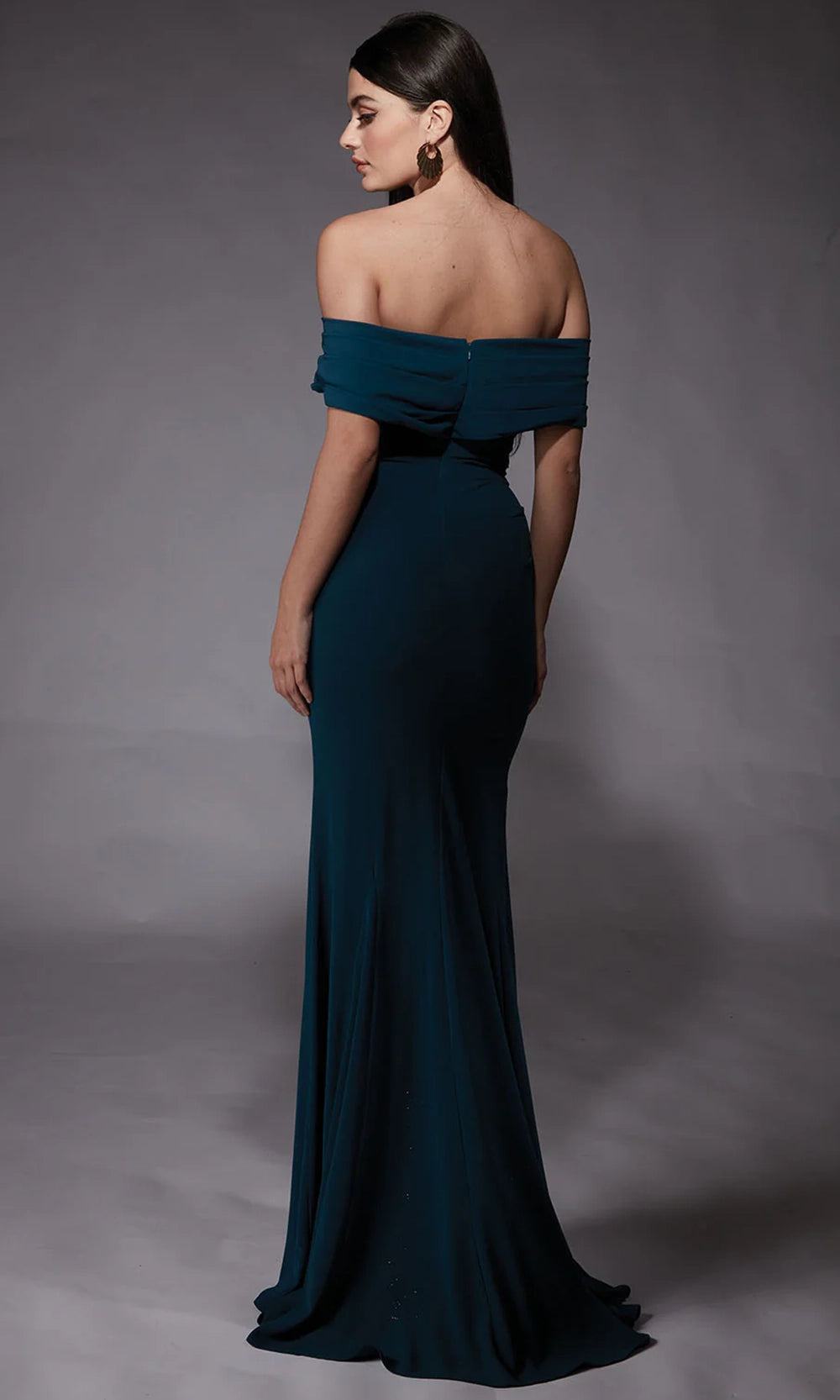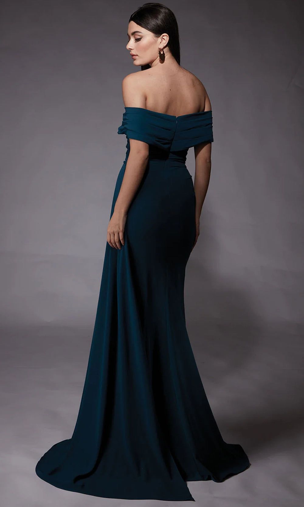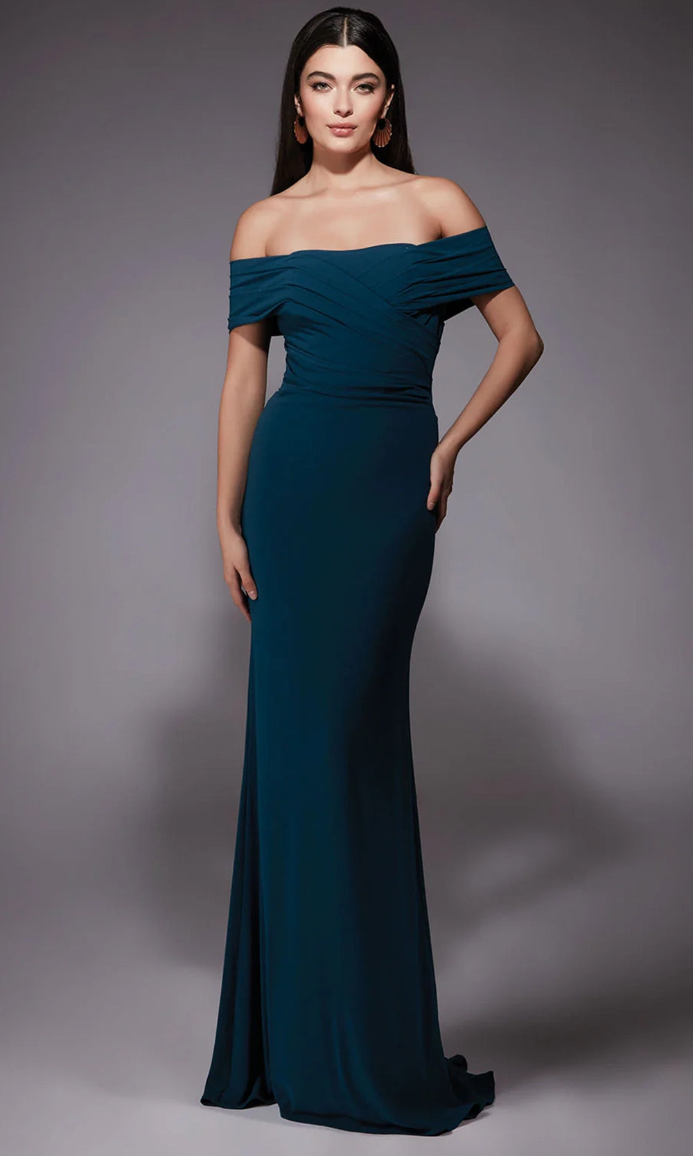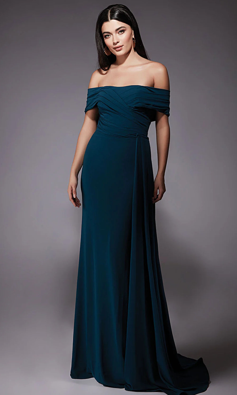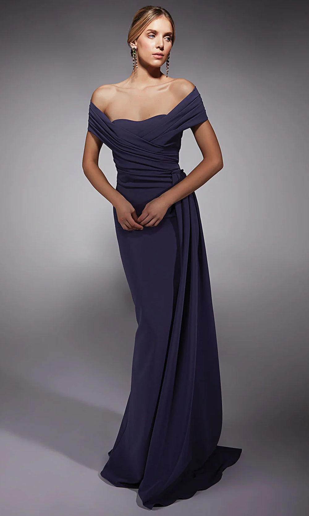 Leave a timeless impression in the Alyce Paris 27745 dress that captures the essence of graceful elegance. It showcases timeless beauty through a ruched bodice that enhances natural curves while remaining sleek and polished. Its fitted sheath silhouette follows the body gracefully, creating a statuesque effect that feels both powerful and feminine. The off-shoulder short sleeves and straight across neckline adds a romantic frame, ideal for highlighting decolletage. The look is elevated with a side overskirt that detaches with ease, flowing into a soft train that trails behind beautifully. Alyce Paris 27745 ensures you do so with quiet sophistication and contemporary poise. Models are wearing Grape, and Midnight colors.