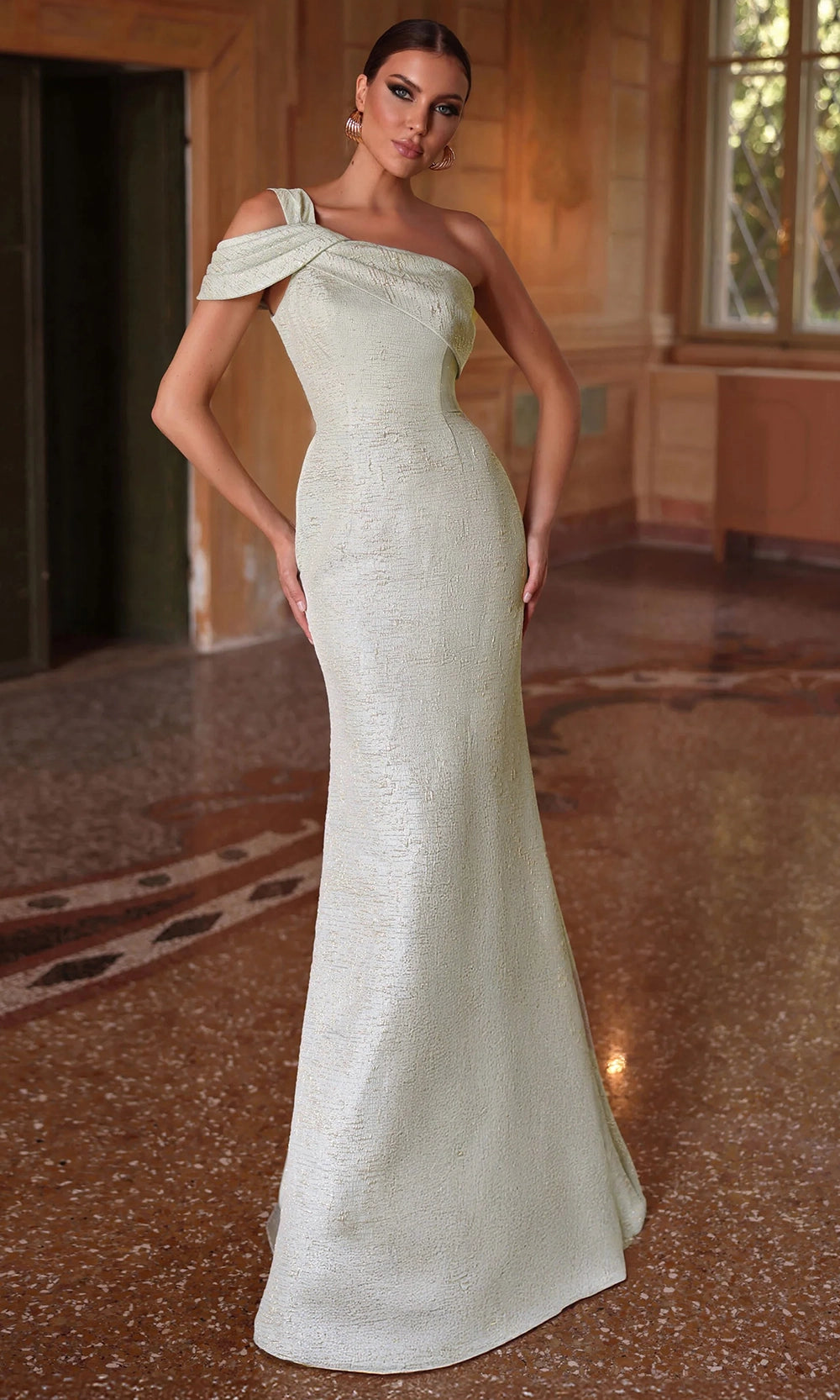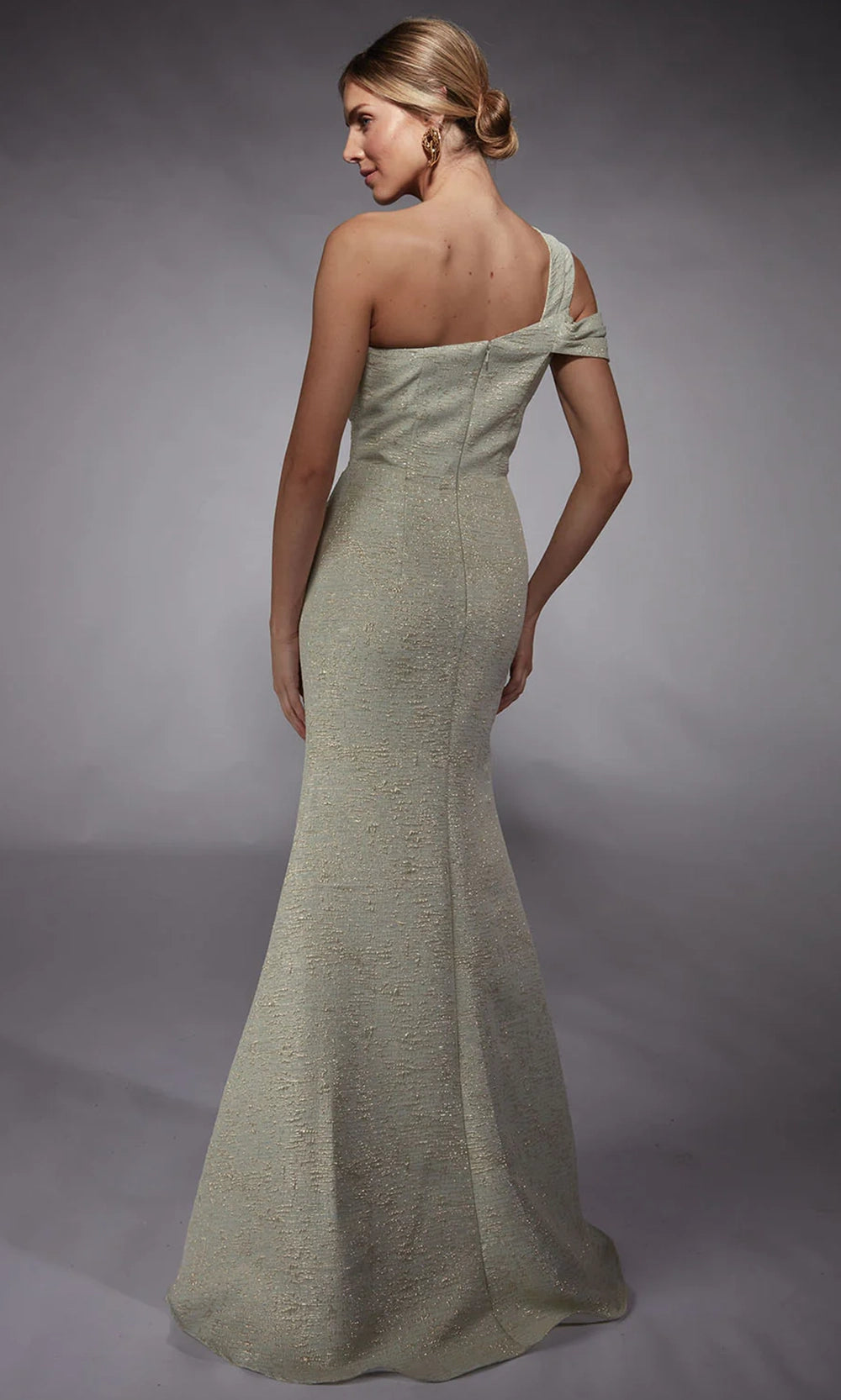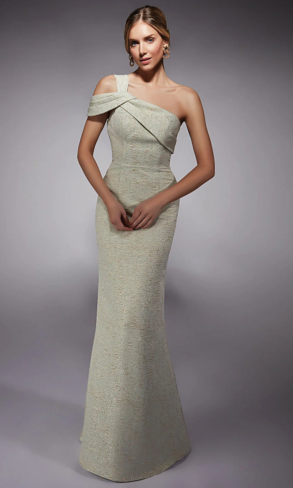 Sleek structure and modern design set the tone for the Alyce Paris 27749. Featuring a cold shoulder draped sleeve, asymmetrical neckline and a sculpted fitted silhouette, this jacquard style radiates contemporary grace with its luxurious shimmer texture. The full-length sheath cut enhances a streamlined effect, while subtle tailoring at the waist adds a hint of contour. Perfect for polished looks with an edge, the Alyce Paris 27749 is a standout choice that balances minimalism with distinctive charm. Model is wearing Sea Foam-Gold color.