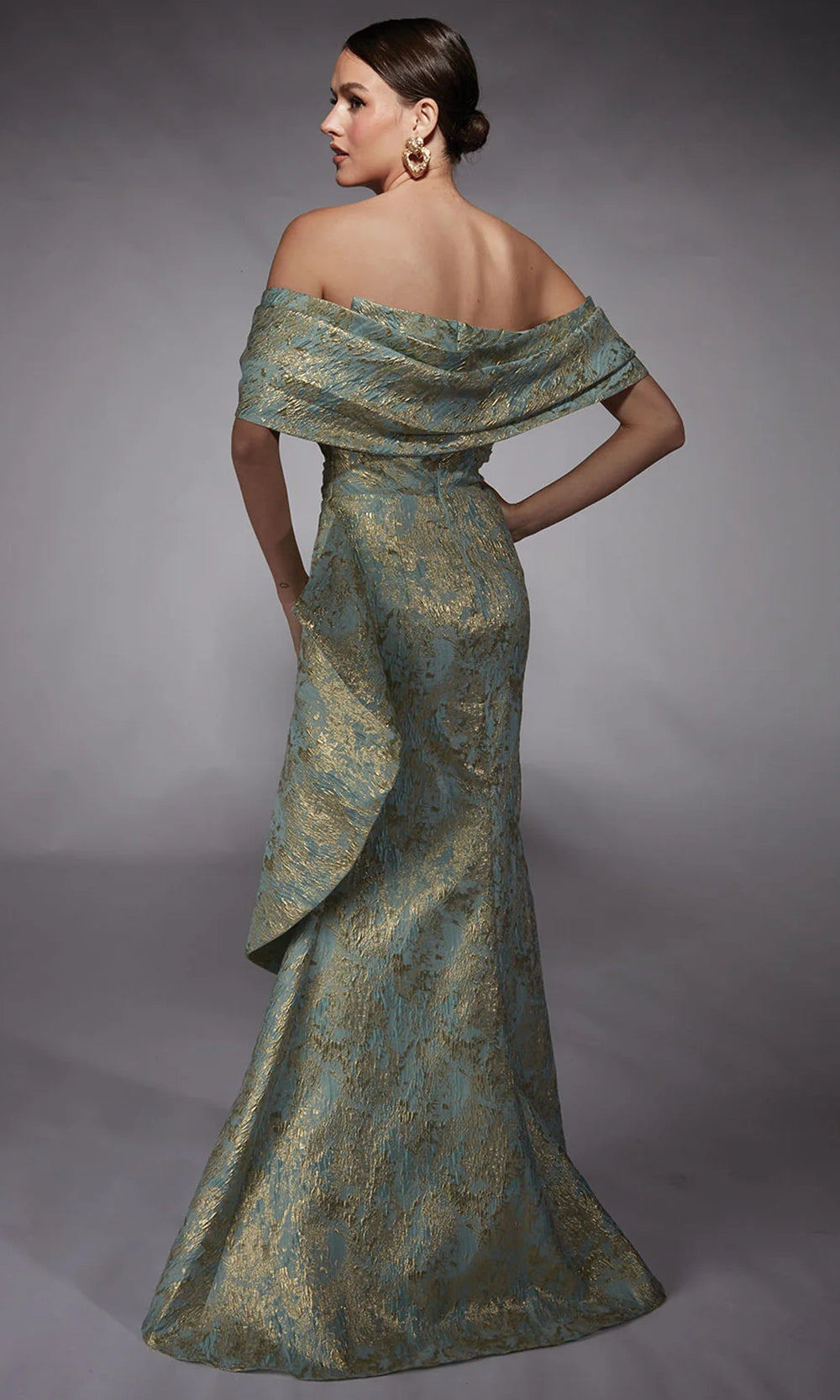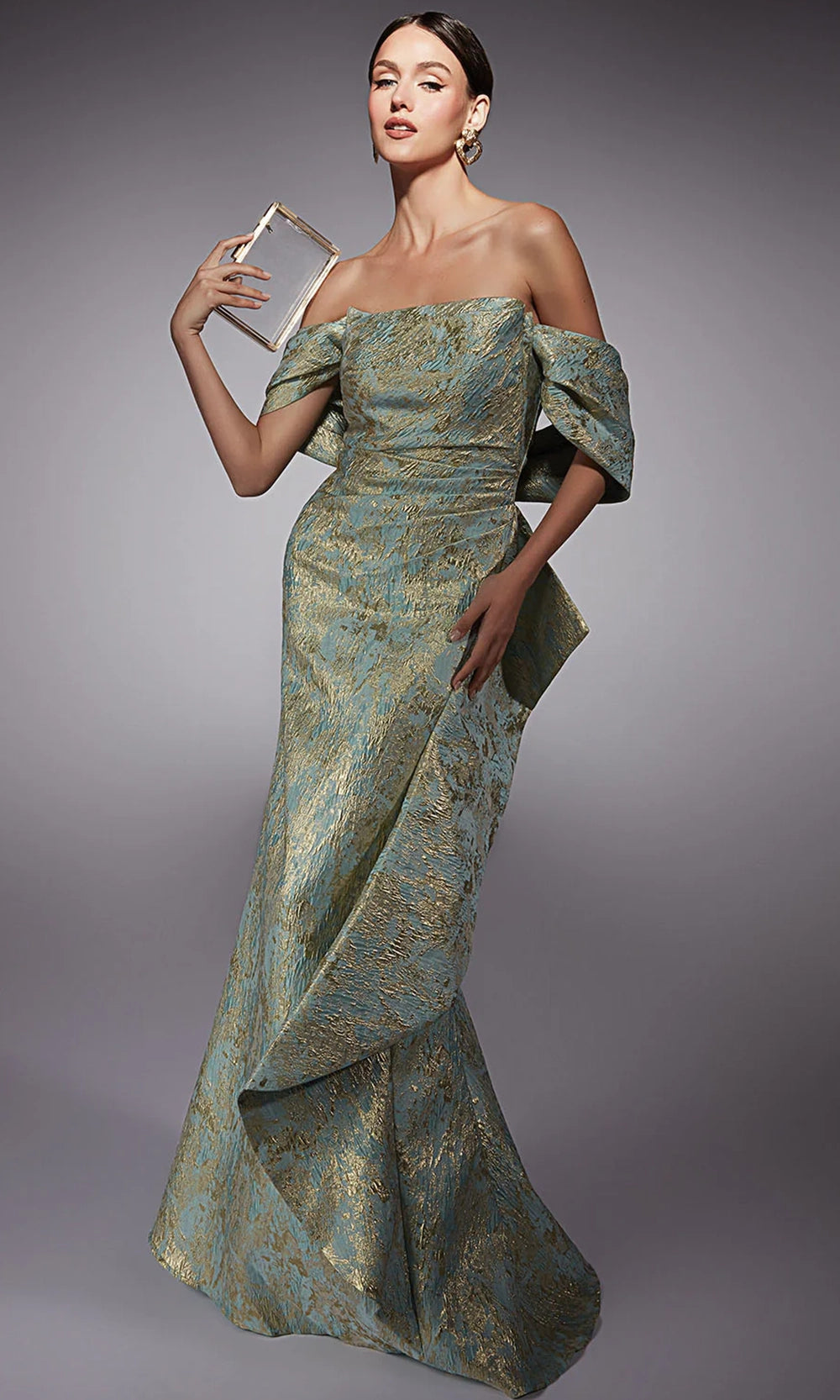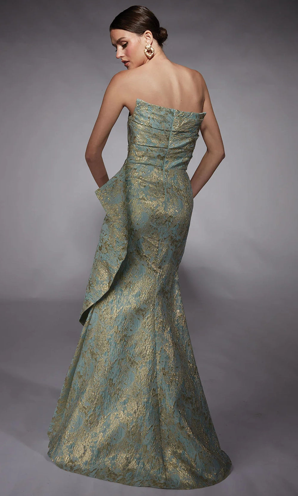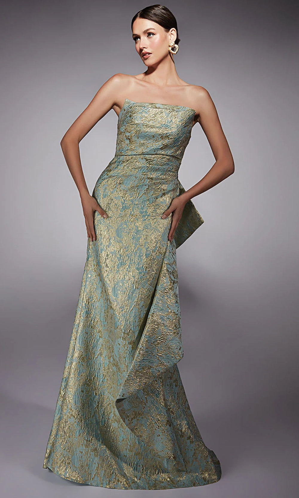 Refined glamour finds its perfect expression in the Alyce Paris 27750, a masterpiece of structure and sophistication. Crafted in metallic jacquard brocade, this strapless design flatters with its straight-across neckline and fitted bodice. The striking gold-accented pattern enhances the visual depth, while a side drape at the waist and detachable off-shoulder sleeves provides sculptural elegance. Its mermaid silhouette flows gracefully to the floor, making it ideal for moments that require elevated fashion. Whether attending a gala or upscale affair, the Alyce Paris 27750 dress delivers a timeless and polished aesthetic. Model is wearing Sea Glass-Gold color.