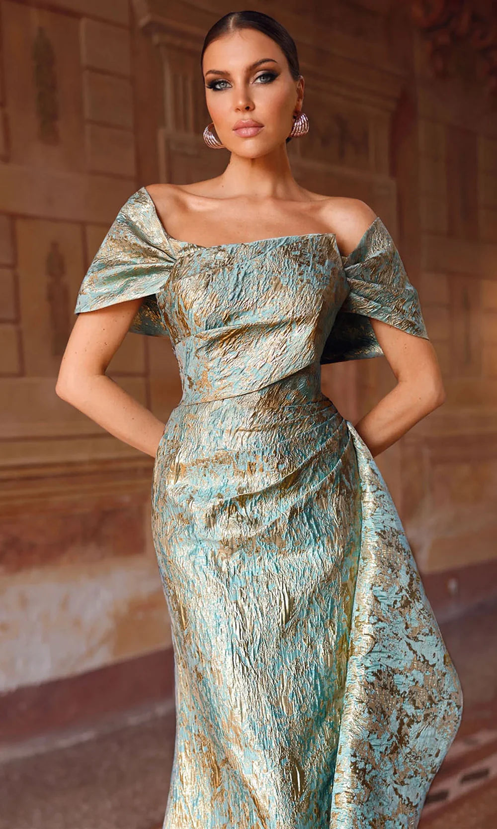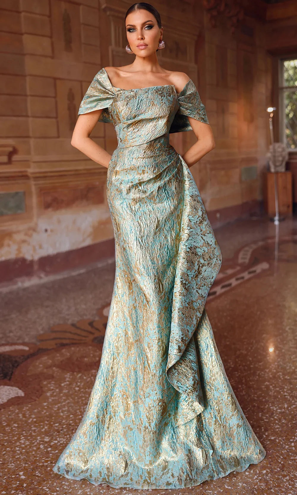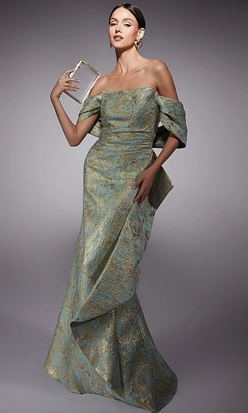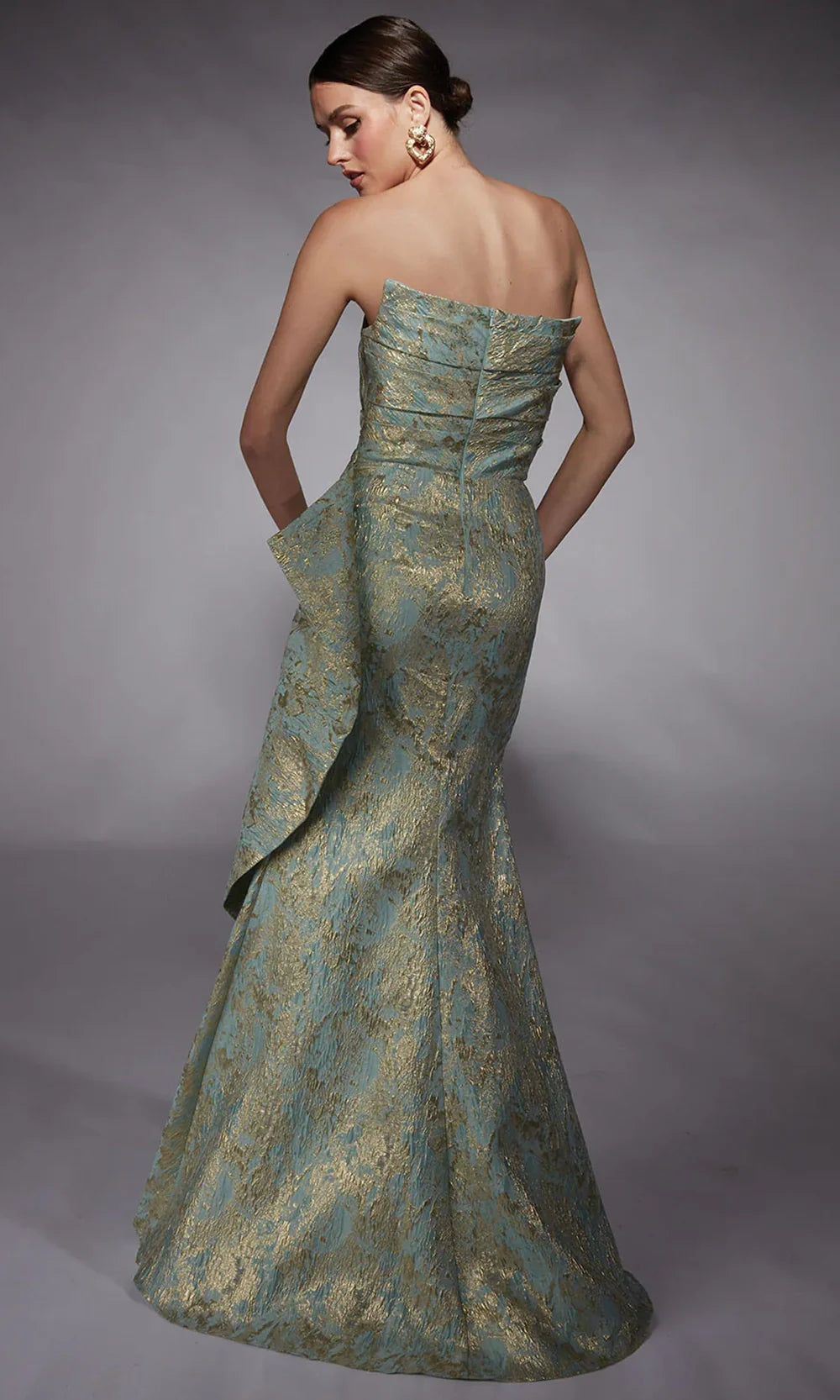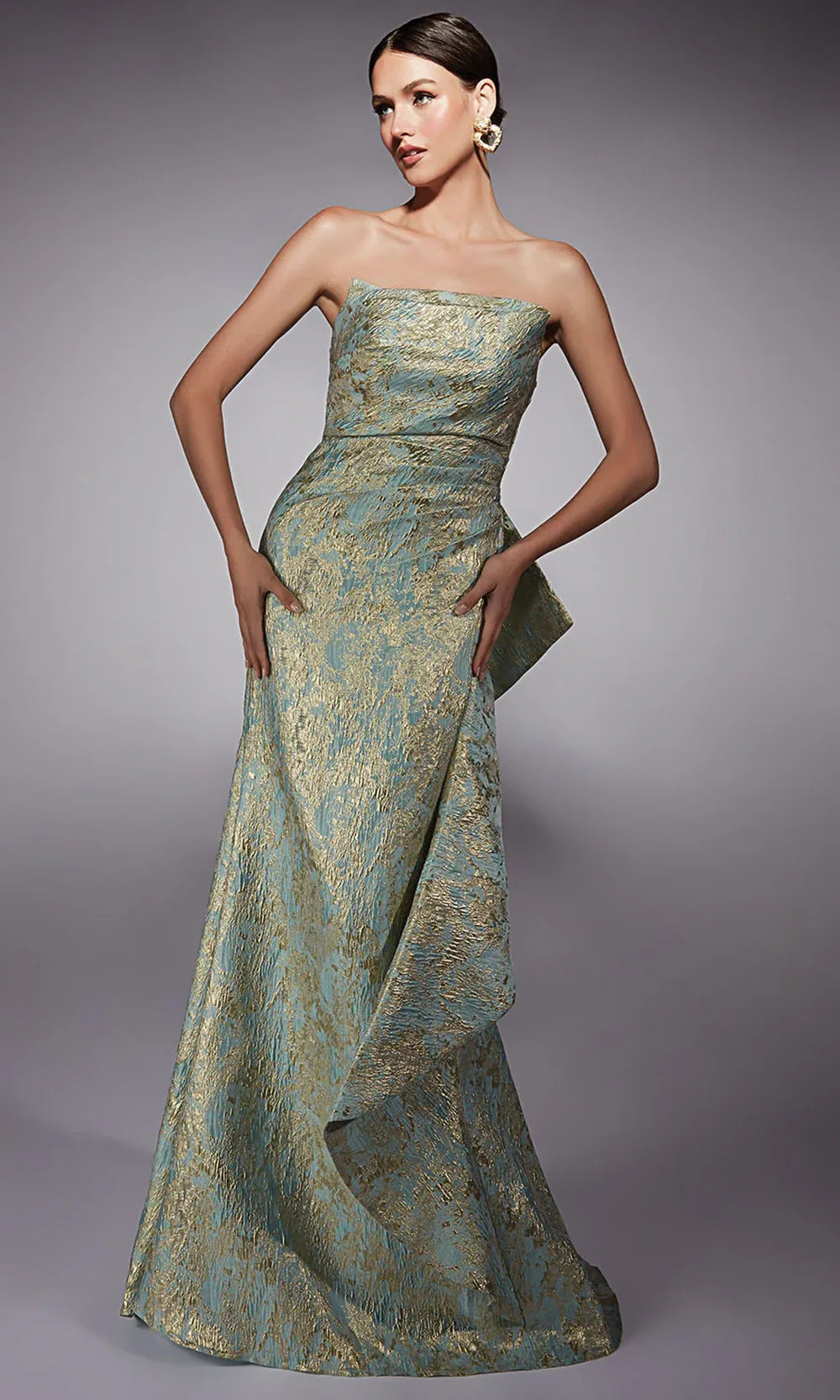 Unveil timeless sophistication with the Alyce Paris 27750 gown. Designed in metallic jacquard brocade, this strapless beauty features a classic straight-across neckline that flatters the décolletage. Sculpted to enhance your curves, it features a side waist drape and removable off-shoulder sleeves for a versatile look. The gold-accented pattern adds visual intrigue, while the mermaid silhouette flows elegantly to the floor. Whether you're attending a gala or black-tie event, this dress is a polished expression of high-end style.