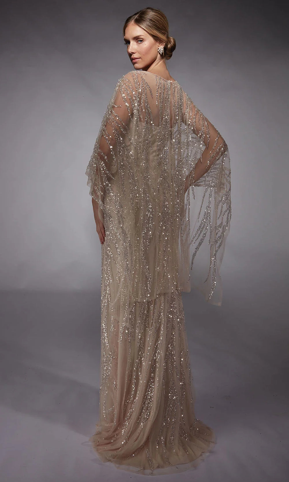 | Details: | Sheer Capelet, Patterned Sequin, Partial Illusion Back, Sweep Train, High Slit, Wrap Skirt |