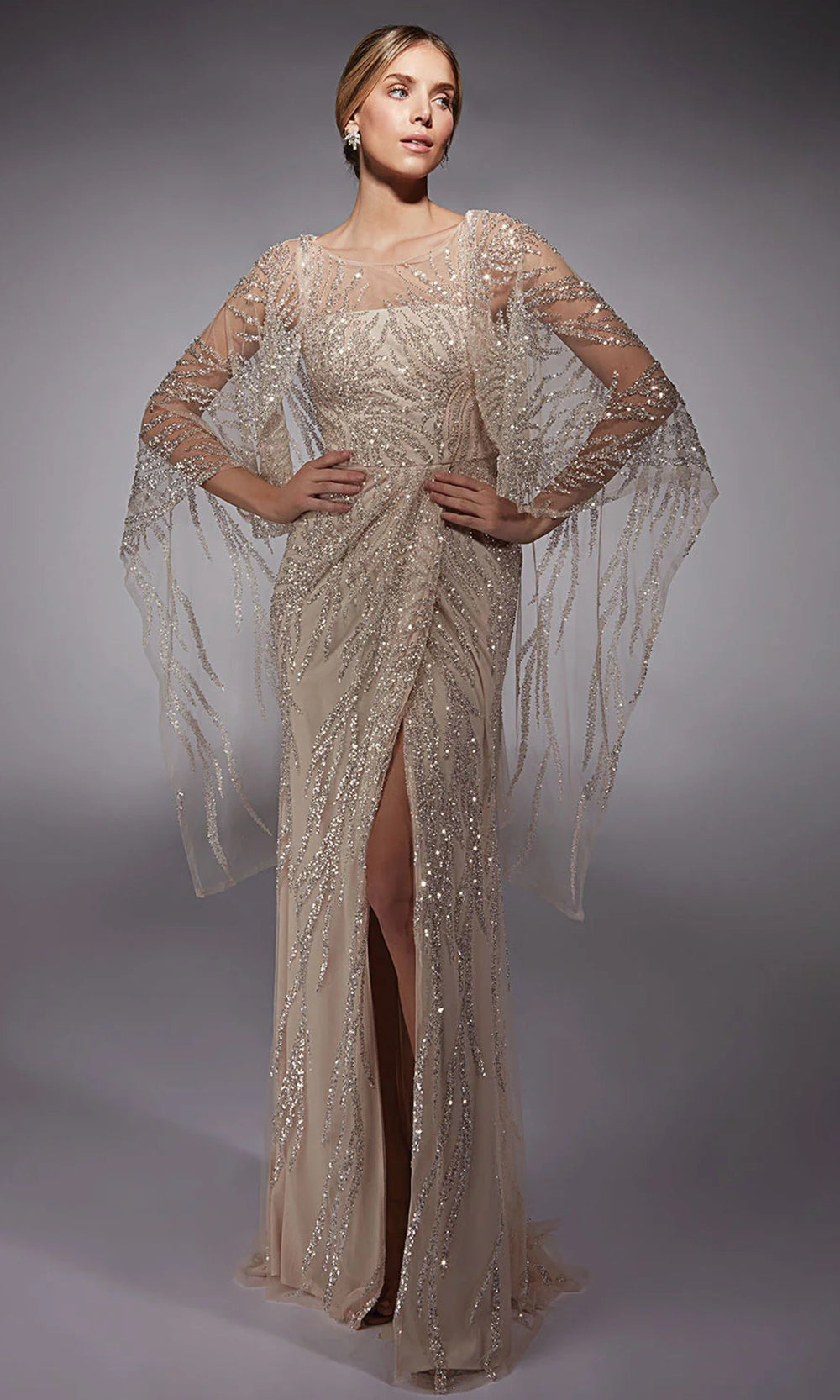 With a vision of ethereal elegance, Alyce Paris 27754 showcases an illusion bateau neckline that seamlessly blends into sheer cape-style sleeves. The bodice is thoughtfully ruched to accentuate shape, giving way to a sweeping floor-length sheath skirt with a front slit. Radiant sequin embellishments catch the light beautifully, adding a layer of glamour to the look. The sheer overlay softens the sparkle, making this gown a delicate balance of luxury and grace. Alyce Paris 27754 invites you to enchant with quiet confidence and shimmering detail. Model is wearing Pink Champagne color.