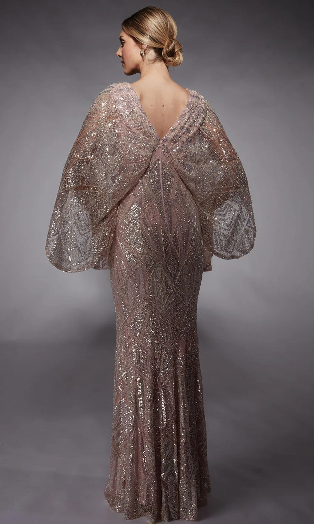 | Details: | Geometric Sequins, Sheer Cape-Style Sleeves, V-Open Back, Fitted Bodice |